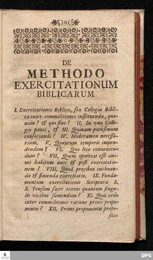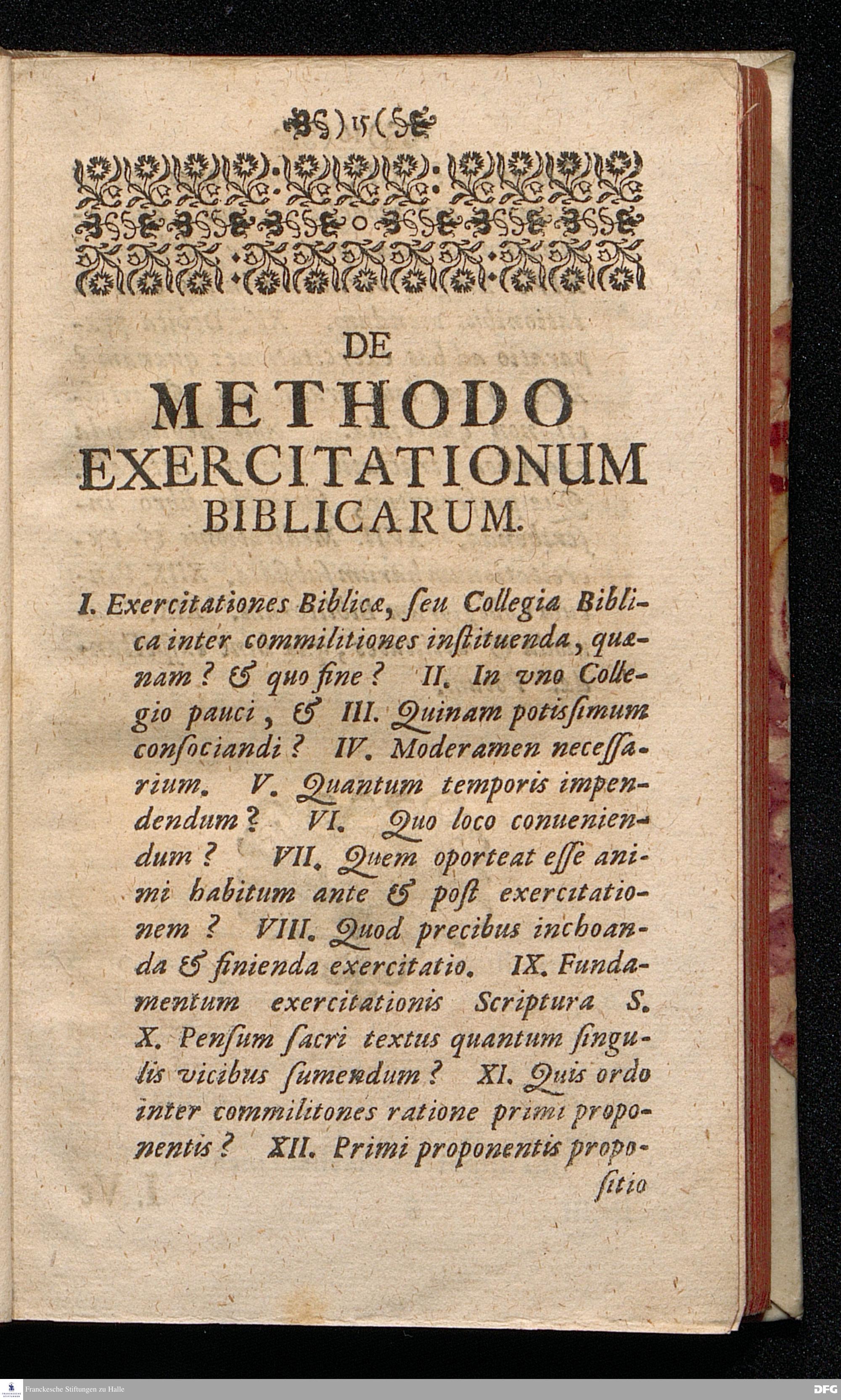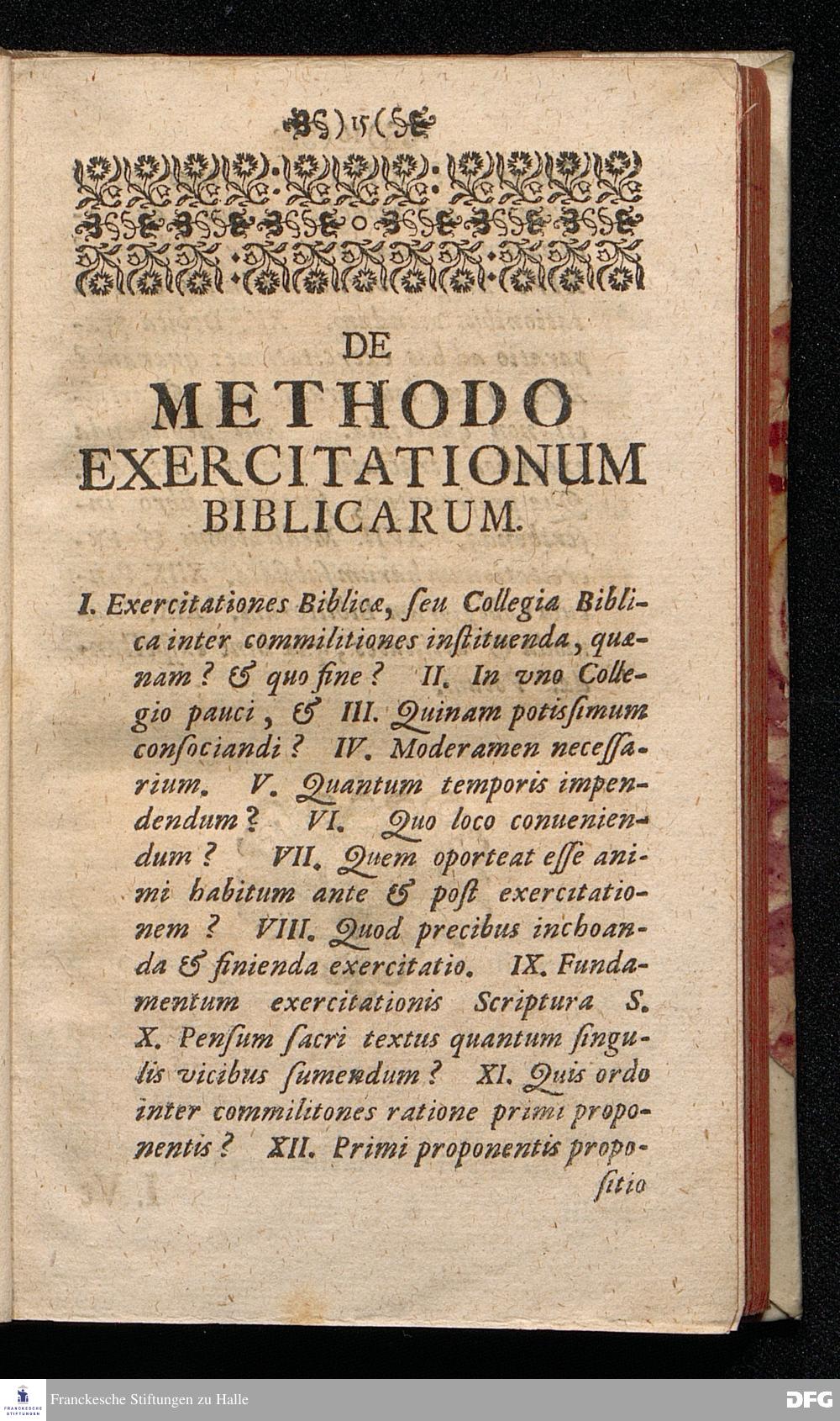 METHODUS EXERCITATIONUM BIBLICARUM, QVAE CONSILIO ET AUCTORITATE ORDINIS THEOLOGICI IN ACADEMIA HALENSI Inter THEOLOGIAE STUDIOSOS, vt ea, quæ discunt, ad praxin viuam & futurum etiam vsum ministerialem perpetuo referant, & adhuc Institutæ, & imposterum instituendæ sunt, Præmissa ad Studiosos Parænesi, delineata ab AUGUSTO HERM. FRANKIO, SS.Theol.Profess.Ordin. Editio Secunda. HALAE, Typis ORPHANOTROPHII, An. MDCCVII.
