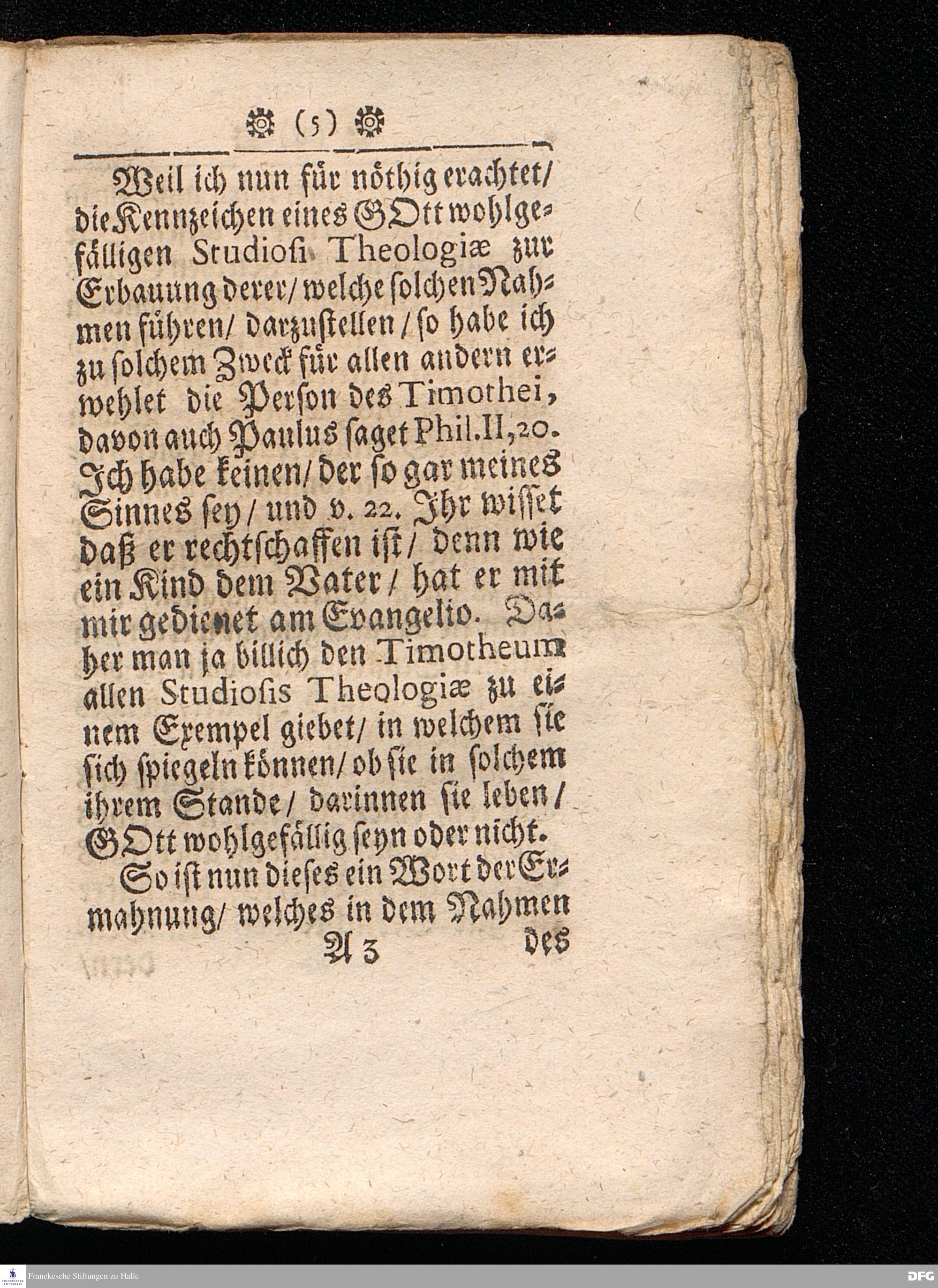 Timotheus Zum Fürbilde Allen Theologiæ Studiosis dargestellet von M.Aug.Hermann Francken / S.Theol.Prof.P.Ord.& Past.Glauch. Editio tertia. [Bibelzitat.] Halle / verlegts Joh.Friedrich Zeitler 1704.