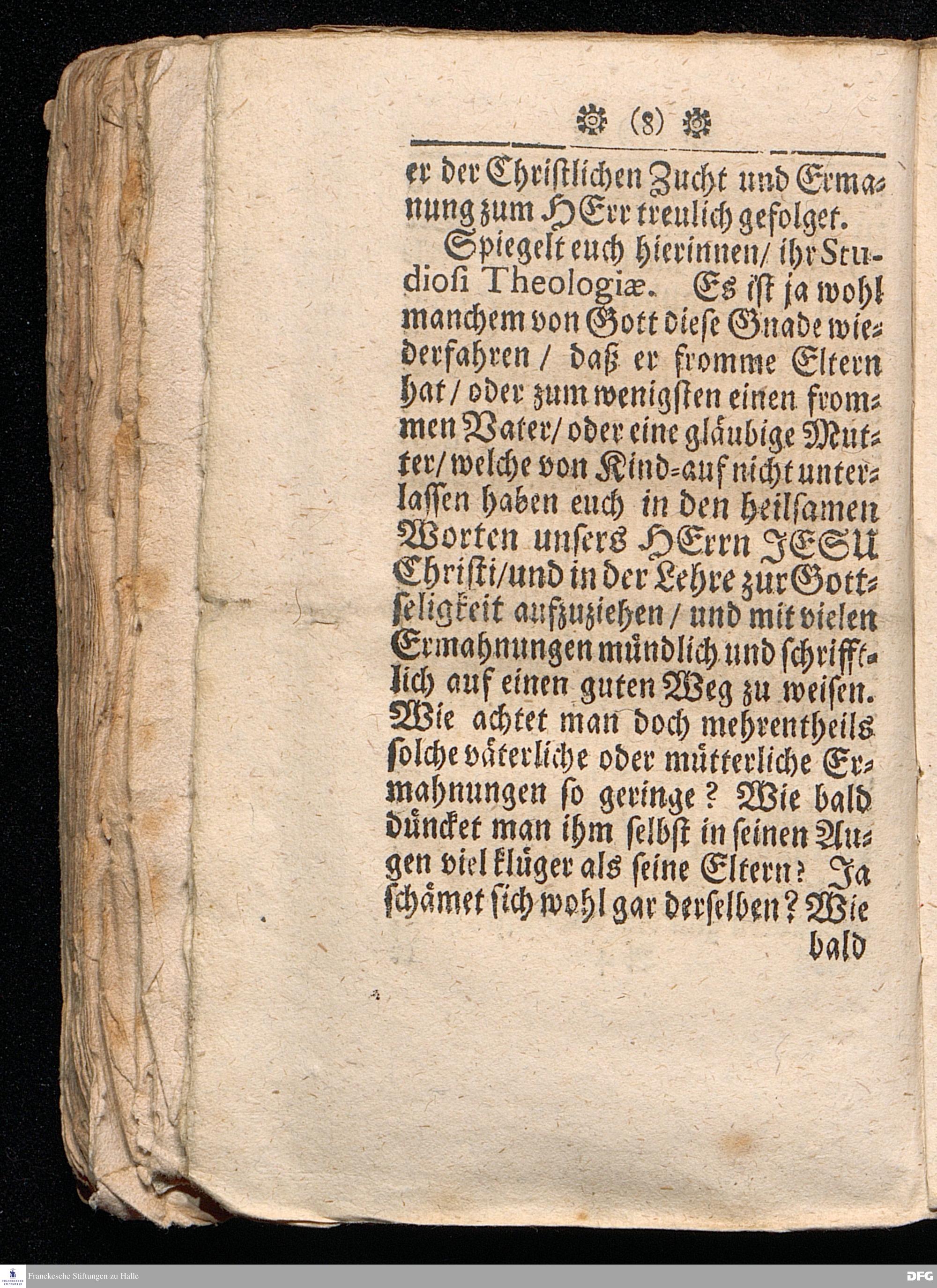 Timotheus Zum Fürbilde Allen Theologiæ Studiosis dargestellet von M.Aug.Hermann Francken / S.Theol.Prof.P.Ord.& Past.Glauch. Editio tertia. [Bibelzitat.] Halle / verlegts Joh.Friedrich Zeitler 1704.