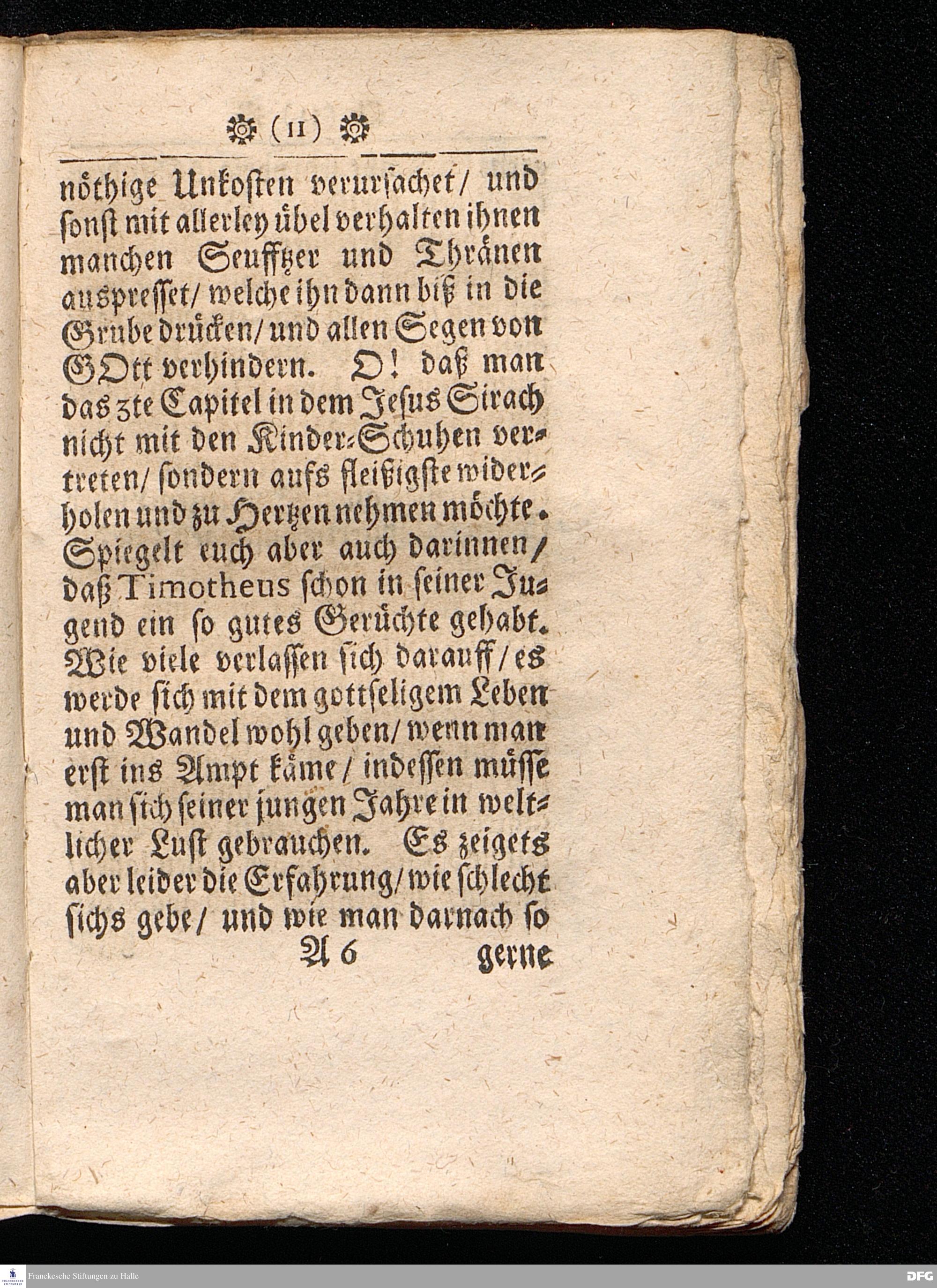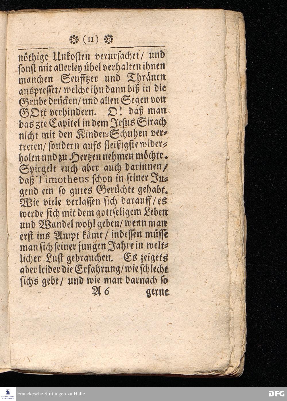 Timotheus Zum Fürbilde Allen Theologiæ Studiosis dargestellet von M.Aug.Hermann Francken / S.Theol.Prof.P.Ord.& Past.Glauch. Editio tertia. [Bibelzitat.] Halle / verlegts Joh.Friedrich Zeitler 1704.