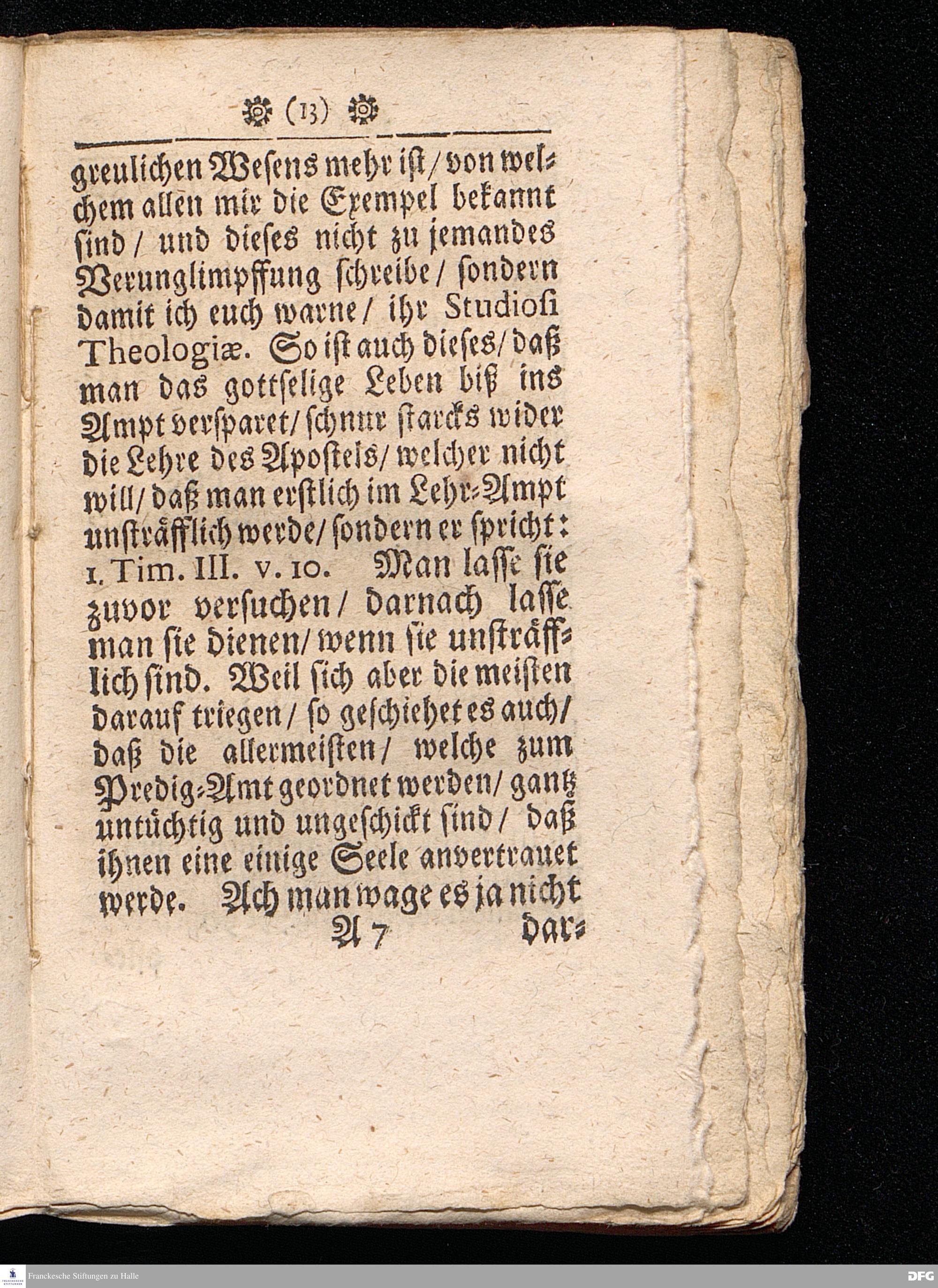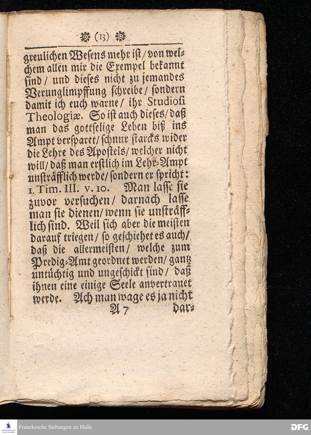 Timotheus Zum Fürbilde Allen Theologiæ Studiosis dargestellet von M.Aug.Hermann Francken / S.Theol.Prof.P.Ord.& Past.Glauch. Editio tertia. [Bibelzitat.] Halle / verlegts Joh.Friedrich Zeitler 1704.