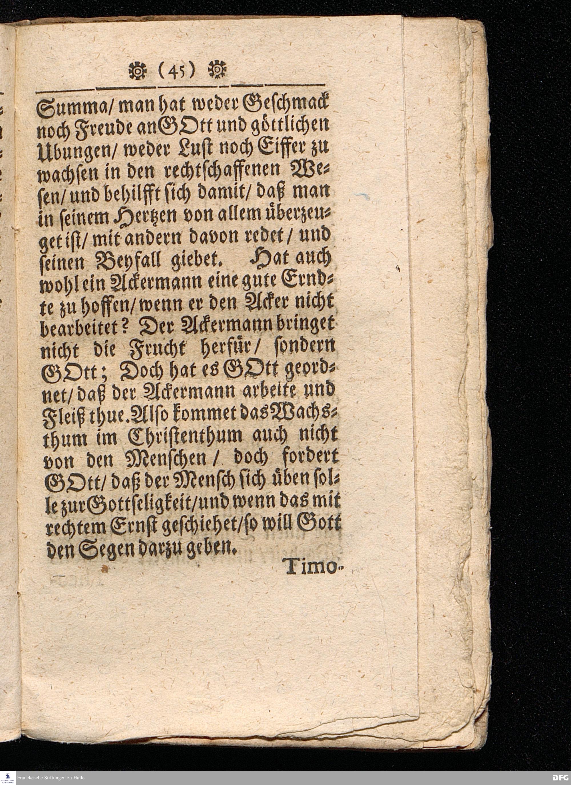 Timotheus Zum Fürbilde Allen Theologiæ Studiosis dargestellet von M.Aug.Hermann Francken / S.Theol.Prof.P.Ord.& Past.Glauch. Editio tertia. [Bibelzitat.] Halle / verlegts Joh.Friedrich Zeitler 1704.
