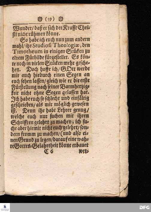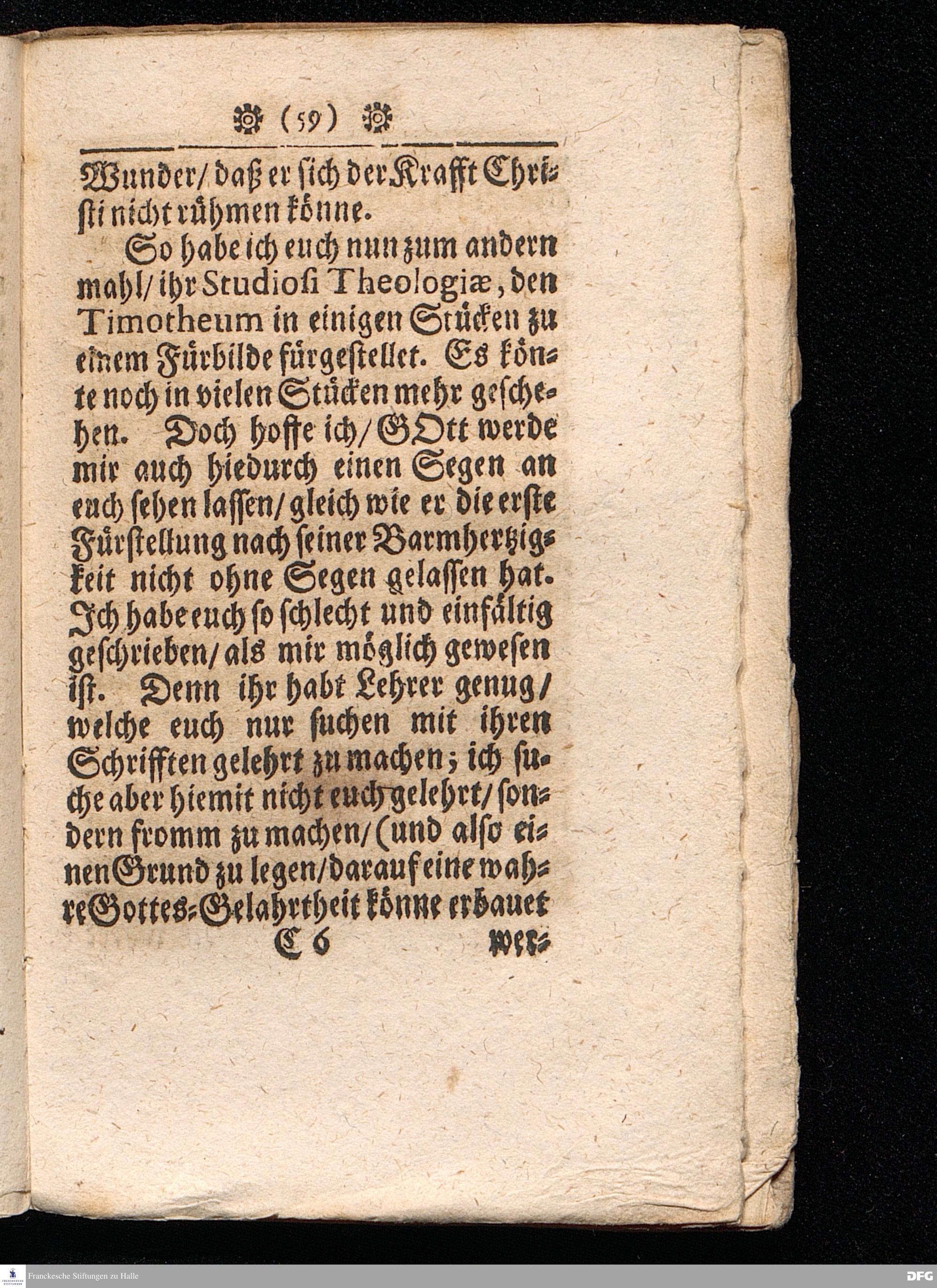 Timotheus Zum Fürbilde Allen Theologiæ Studiosis dargestellet von M.Aug.Hermann Francken / S.Theol.Prof.P.Ord.& Past.Glauch. Editio tertia. [Bibelzitat.] Halle / verlegts Joh.Friedrich Zeitler 1704.