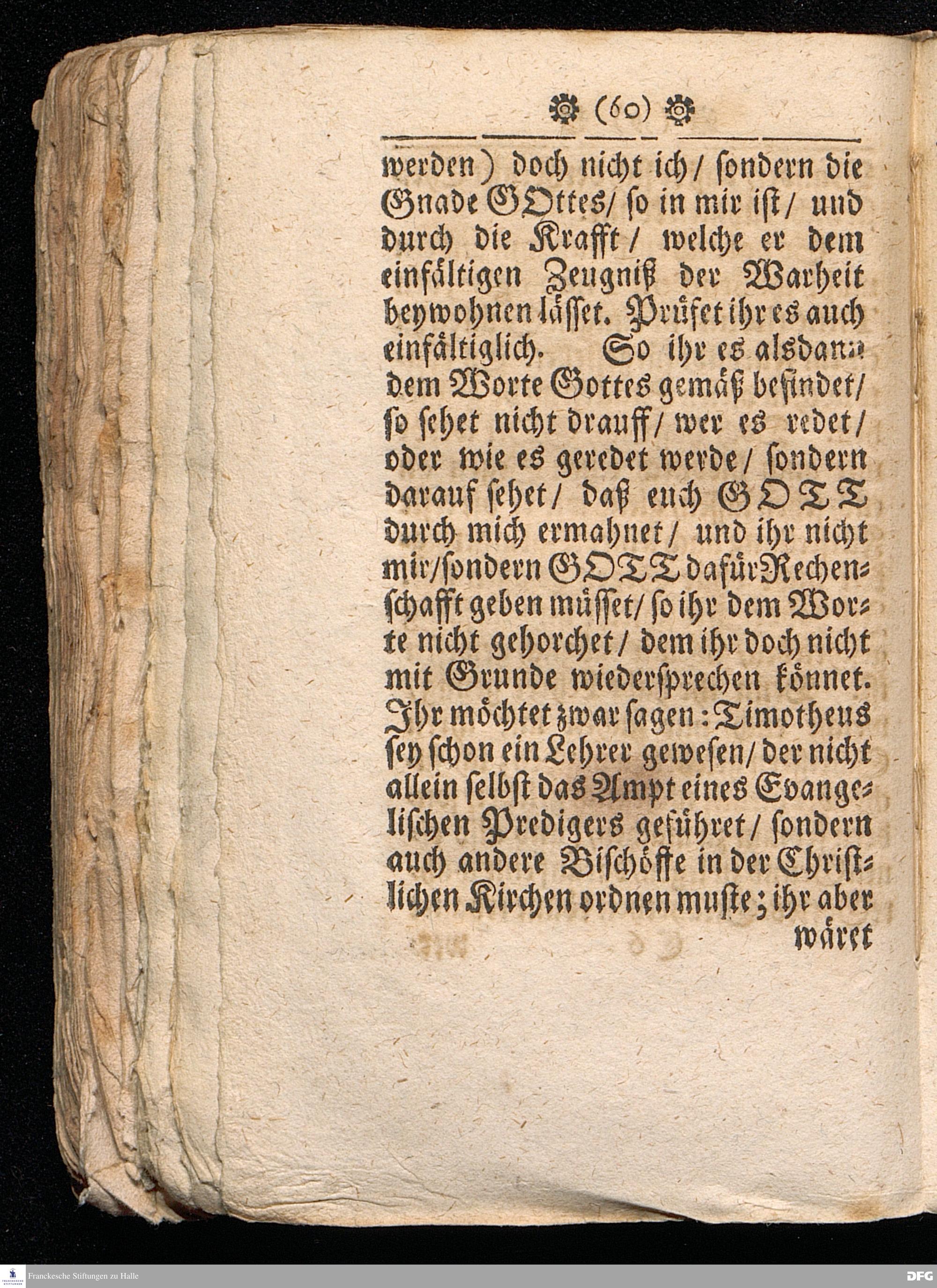 Timotheus Zum Fürbilde Allen Theologiæ Studiosis dargestellet von M.Aug.Hermann Francken / S.Theol.Prof.P.Ord.& Past.Glauch. Editio tertia. [Bibelzitat.] Halle / verlegts Joh.Friedrich Zeitler 1704.
