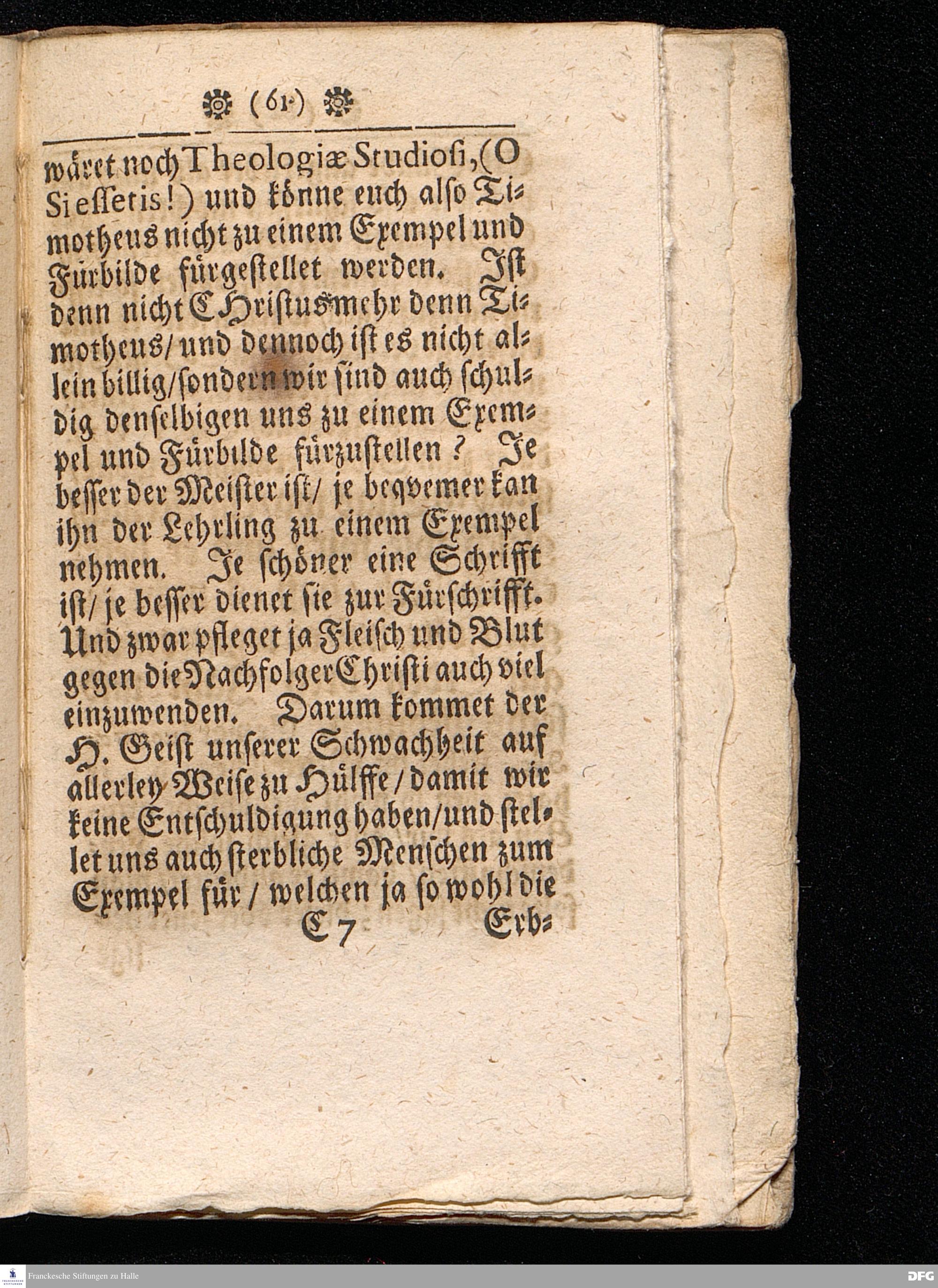 Timotheus Zum Fürbilde Allen Theologiæ Studiosis dargestellet von M.Aug.Hermann Francken / S.Theol.Prof.P.Ord.& Past.Glauch. Editio tertia. [Bibelzitat.] Halle / verlegts Joh.Friedrich Zeitler 1704.