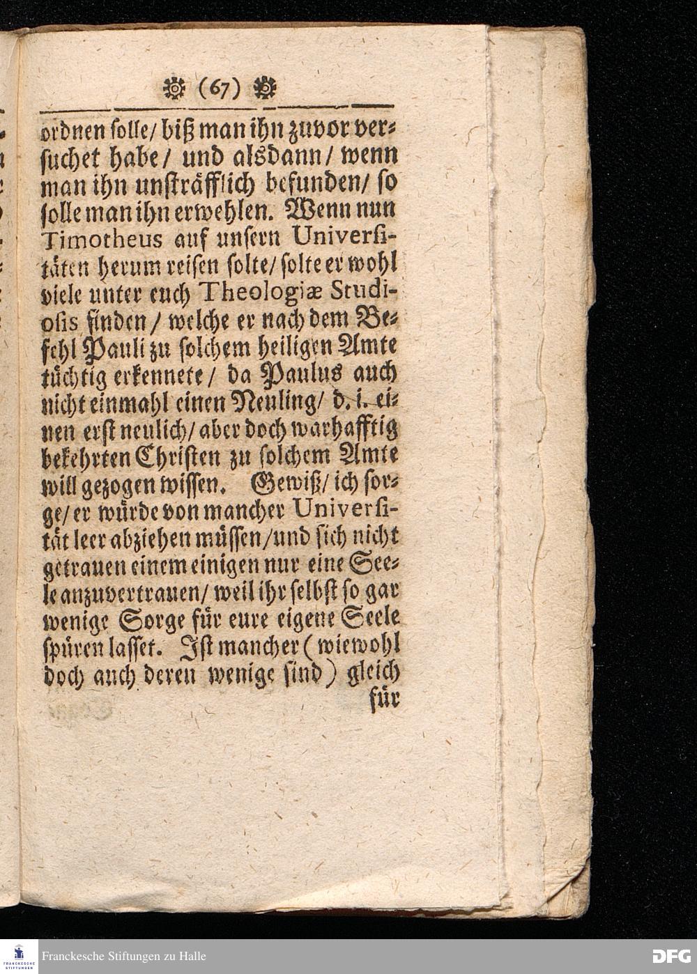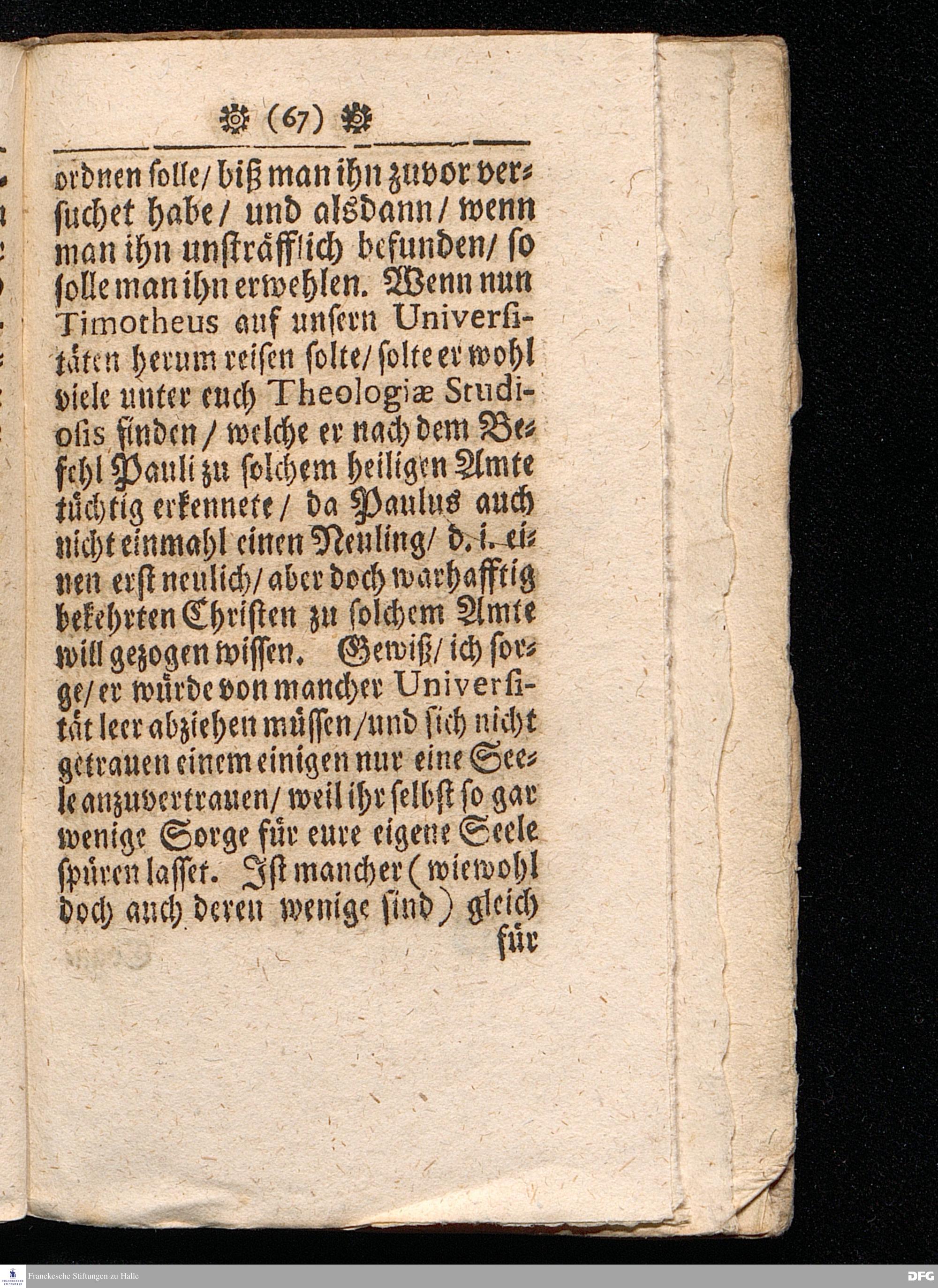 Timotheus Zum Fürbilde Allen Theologiæ Studiosis dargestellet von M.Aug.Hermann Francken / S.Theol.Prof.P.Ord.& Past.Glauch. Editio tertia. [Bibelzitat.] Halle / verlegts Joh.Friedrich Zeitler 1704.