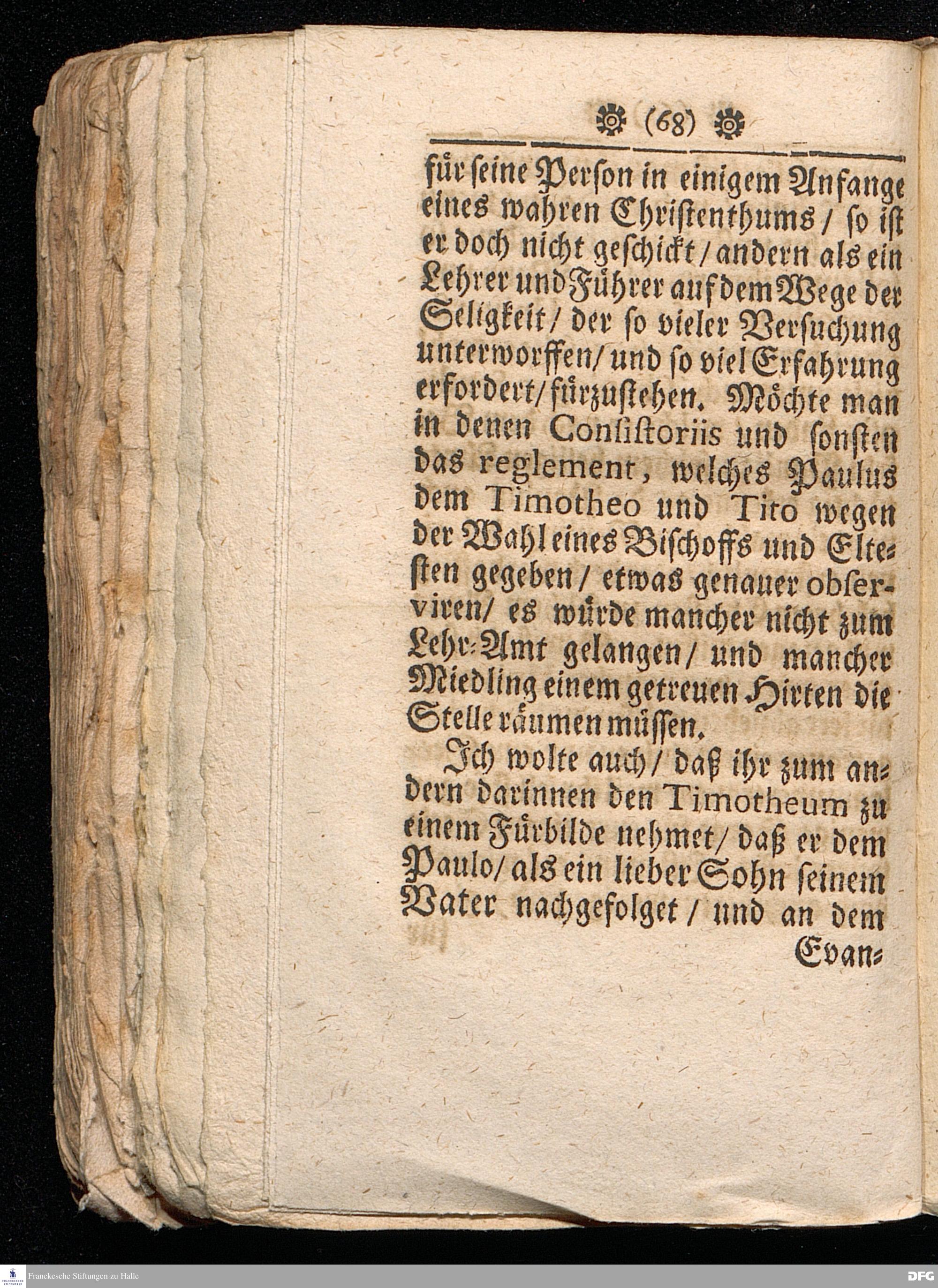 Timotheus Zum Fürbilde Allen Theologiæ Studiosis dargestellet von M.Aug.Hermann Francken / S.Theol.Prof.P.Ord.& Past.Glauch. Editio tertia. [Bibelzitat.] Halle / verlegts Joh.Friedrich Zeitler 1704.