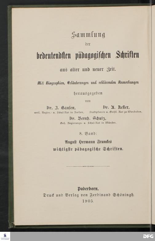 August Hermann Franckes wichtigste pädagogische Schriften. Herausgegeben und mit einer Einleitung versehen von Johannes Gansen. Zweite Auflage, bearbeitet von Dr.[Adolf] Kreisel, Seminardirektor. Mit dem Bildnisse August Hermann Franckes. Paderborn. Druck und Verlag von Ferdinand Schöningh. 1905.