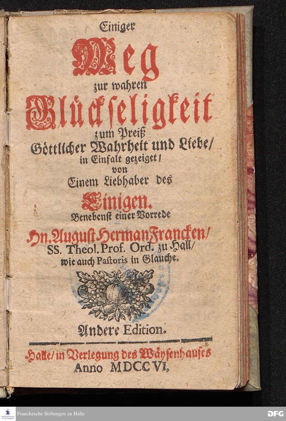 Einiger Weg zur wahren Glückseligkeit zum Preiß Göttlicher Wahrheit und Liebe / in Einfalt gezeiget / von Einem Liebhaber des Einigen. Benebst einer Vorrede Hn. August Herman[n] Francken / SS.Theol.Prof.Ord.zu Hall[e] / wie auch Pastoris in Glauche. Andere Edition. Halle / in Verlegung des Wäysenhauses Anno MDCCVI.