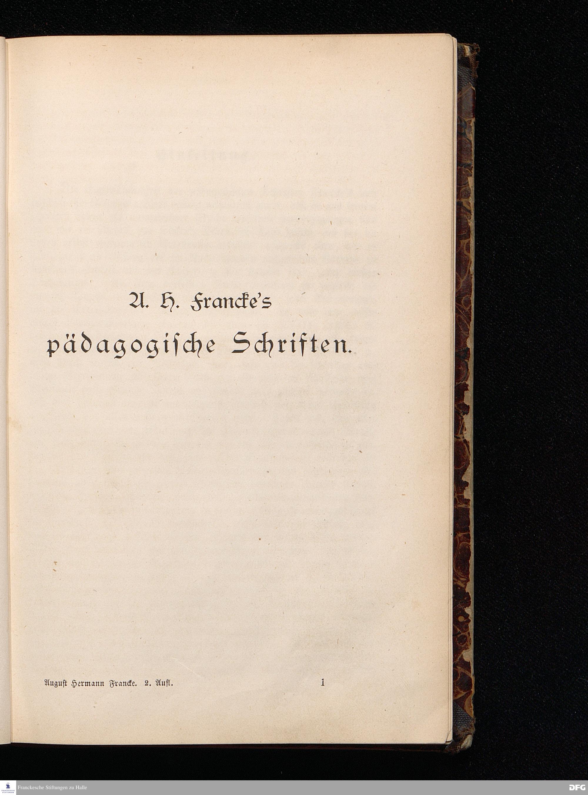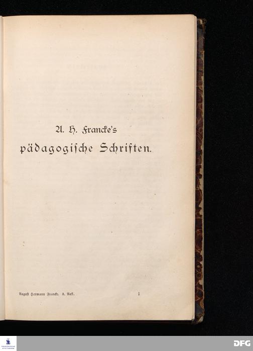 A.H.Francke's Pädagogische Schriften. Nebst der Darstellung seines Lebens und seiner Stiftungen herausgegeben von D. G[ustav] Kramer, Geh.Regierungsrat. Zweite, durchgesehene und vervollständigte Ausgabe. Langensalza, Druck und Verlag von Hermann Beyer & Söhne. 1885.