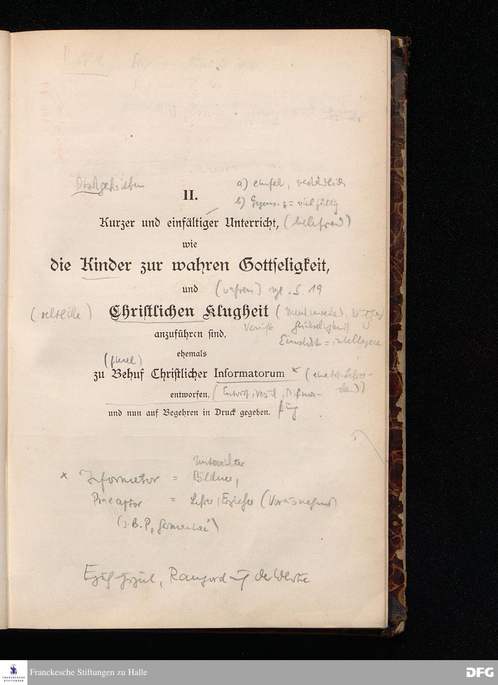 A.H.Francke's Pädagogische Schriften. Nebst der Darstellung seines Lebens und seiner Stiftungen herausgegeben von D. G[ustav] Kramer, Geh.Regierungsrat. Zweite, durchgesehene und vervollständigte Ausgabe. Langensalza, Druck und Verlag von Hermann Beyer & Söhne. 1885.