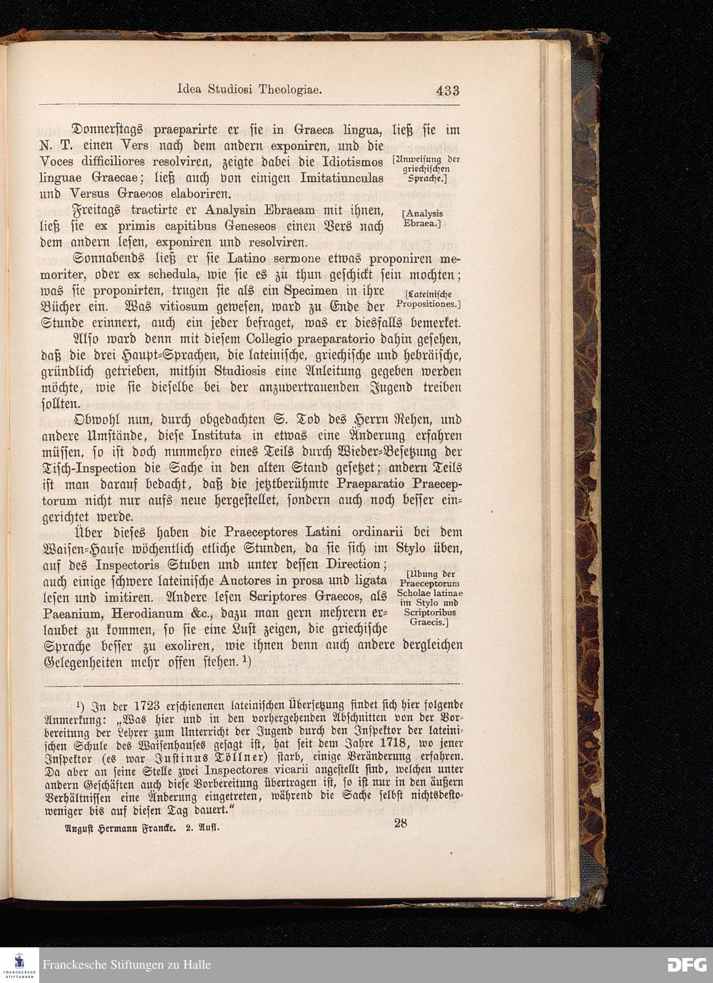 A.H.Francke's Pädagogische Schriften. Nebst der Darstellung seines Lebens und seiner Stiftungen herausgegeben von D. G[ustav] Kramer, Geh.Regierungsrat. Zweite, durchgesehene und vervollständigte Ausgabe. Langensalza, Druck und Verlag von Hermann Beyer & Söhne. 1885.
