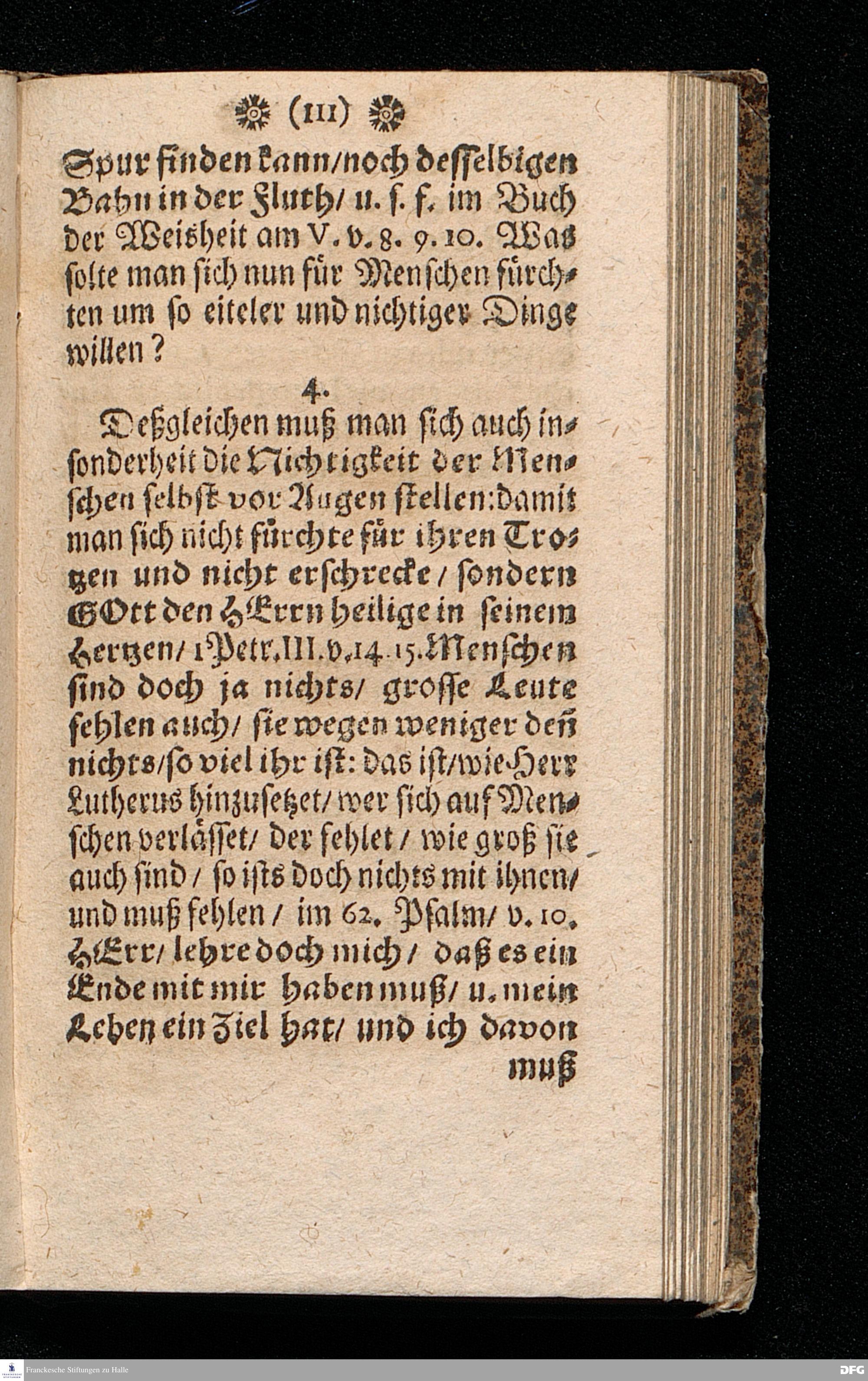 NICODEMUS Oder Tractätlein von der Menschen=Furcht / Deren Beschreibung / Ursachen / Kennzeichen, Schaden, Bemäntelung, dagegen geordneten Mitteln, und wie zu einem freudigen Glauben zu gelangen, und derselbe weislich und nützlich zu gebrauchen, Zu Pflantzung Der wahren Furcht GOttes / In allen Ständen heilsam / besonders aber Dem Lehr=Stande dediciret von August Hermann Francken / SS.Th.Pr.O.& Past.zu St.Ulrich in Halle. vierte Edition. HALLE, gedruckt im Waysenhause MDCCXV.