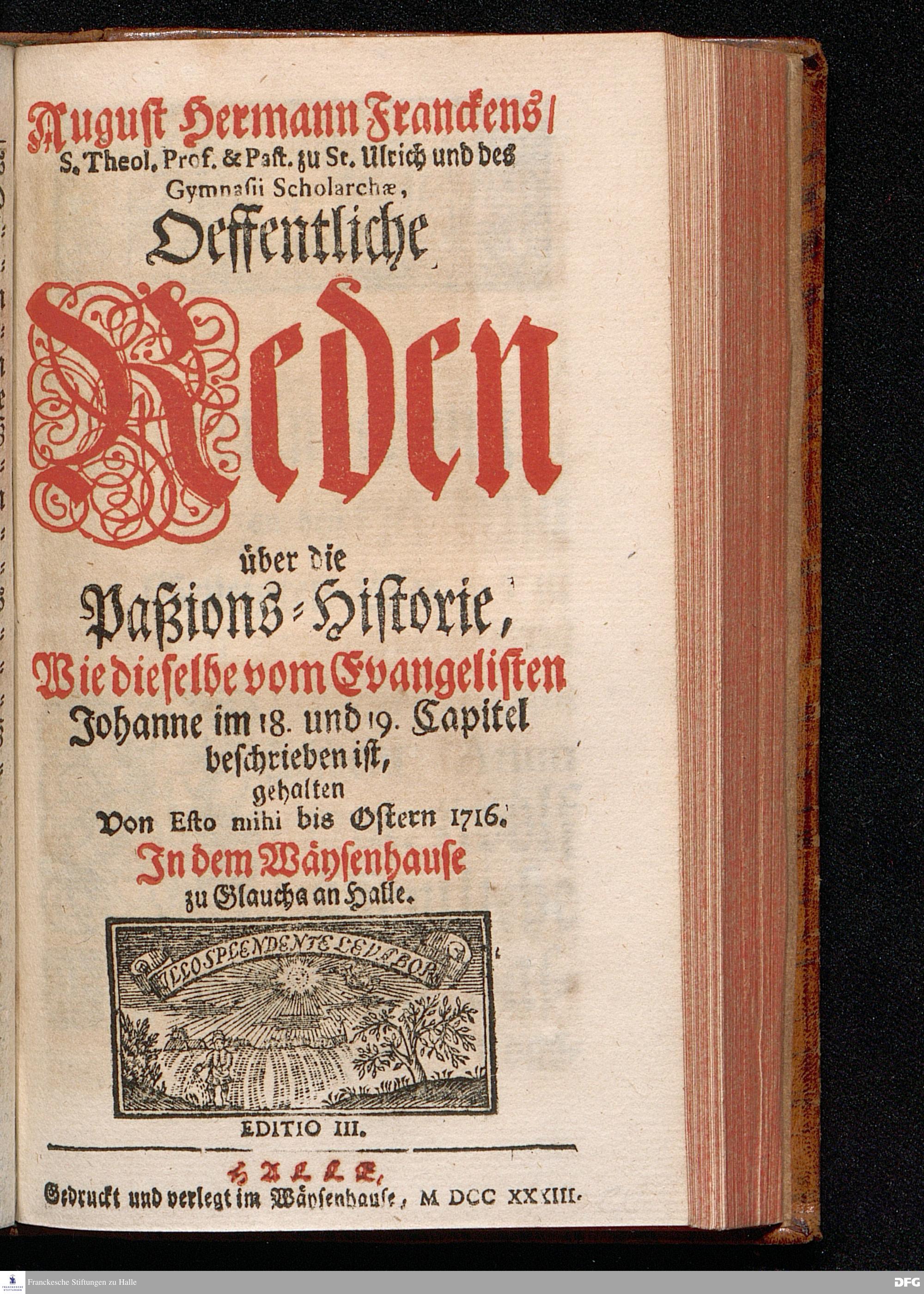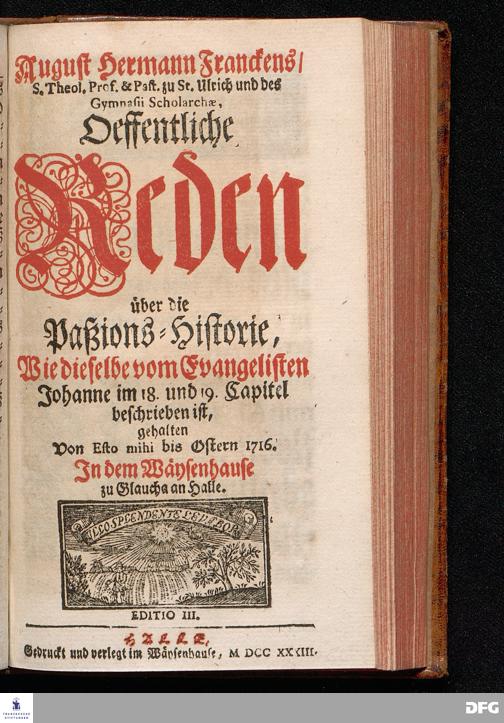 August Hermann Franckens / S.Theol.Prof.& Past.zu St.Ulrich und des Gymnasii Scholarchæ, Oeffentliche Reden über die Paßions=Historie, Wie dieselbe vom Evangelisten Johanne im 18.u.19. Capitel beschrieben ist, gehalten Von Esto mihi bis Ostern 1716. In dem Wäysenhause zu Glaucha an Halle. EDITIO III. HALLE, Gedruckt und verlegt im Wäysenhause, MDCCXXXIII.