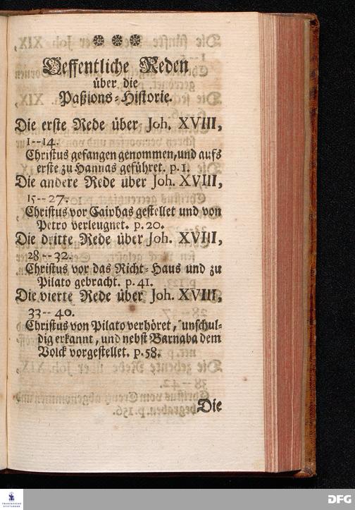 August Hermann Franckens / S.Theol.Prof.& Past.zu St.Ulrich und des Gymnasii Scholarchæ, Oeffentliche Reden über die Paßions=Historie, Wie dieselbe vom Evangelisten Johanne im 18.u.19. Capitel beschrieben ist, gehalten Von Esto mihi bis Ostern 1716. In dem Wäysenhause zu Glaucha an Halle. EDITIO III. HALLE, Gedruckt und verlegt im Wäysenhause, MDCCXXXIII.