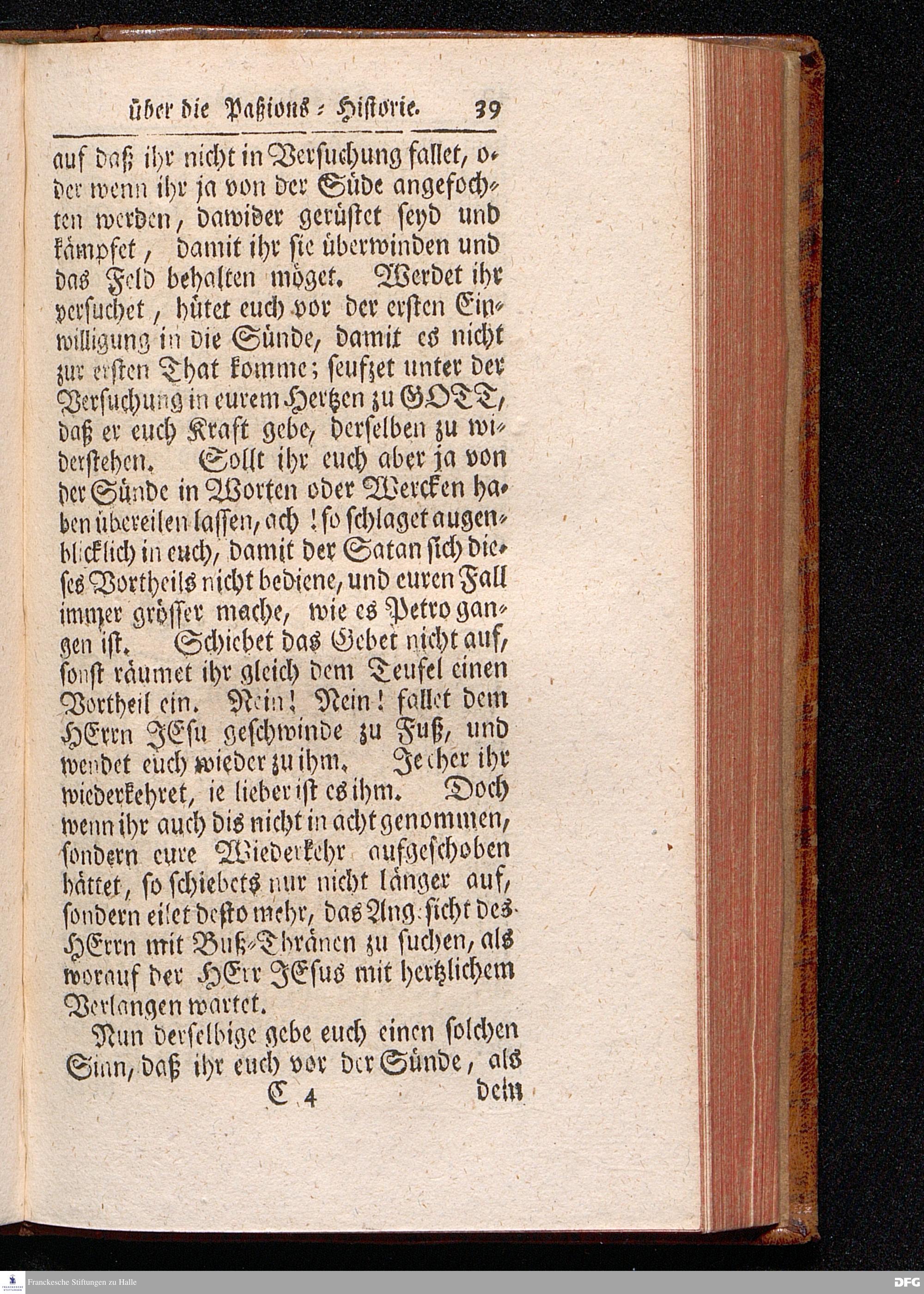 August Hermann Franckens / S.Theol.Prof.& Past.zu St.Ulrich und des Gymnasii Scholarchæ, Oeffentliche Reden über die Paßions=Historie, Wie dieselbe vom Evangelisten Johanne im 18.u.19. Capitel beschrieben ist, gehalten Von Esto mihi bis Ostern 1716. In dem Wäysenhause zu Glaucha an Halle. EDITIO III. HALLE, Gedruckt und verlegt im Wäysenhause, MDCCXXXIII.