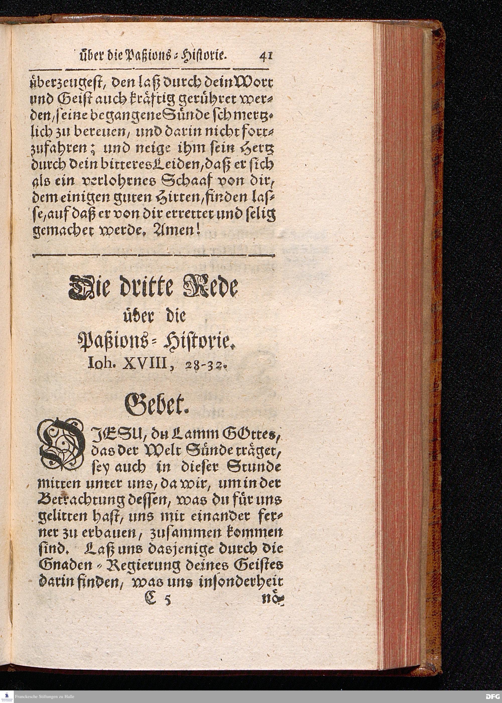 August Hermann Franckens / S.Theol.Prof.& Past.zu St.Ulrich und des Gymnasii Scholarchæ, Oeffentliche Reden über die Paßions=Historie, Wie dieselbe vom Evangelisten Johanne im 18.u.19. Capitel beschrieben ist, gehalten Von Esto mihi bis Ostern 1716. In dem Wäysenhause zu Glaucha an Halle. EDITIO III. HALLE, Gedruckt und verlegt im Wäysenhause, MDCCXXXIII.