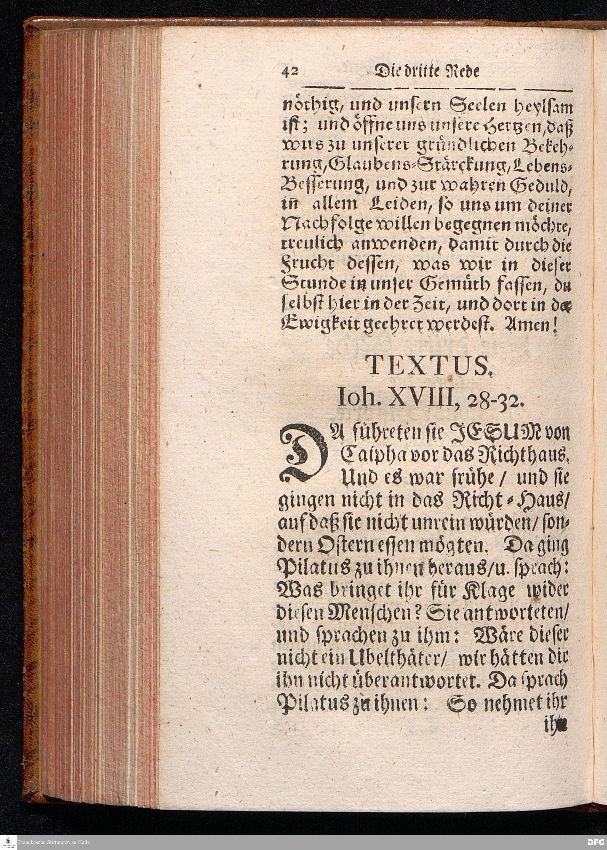 August Hermann Franckens / S.Theol.Prof.& Past.zu St.Ulrich und des Gymnasii Scholarchæ, Oeffentliche Reden über die Paßions=Historie, Wie dieselbe vom Evangelisten Johanne im 18.u.19. Capitel beschrieben ist, gehalten Von Esto mihi bis Ostern 1716. In dem Wäysenhause zu Glaucha an Halle. EDITIO III. HALLE, Gedruckt und verlegt im Wäysenhause, MDCCXXXIII.