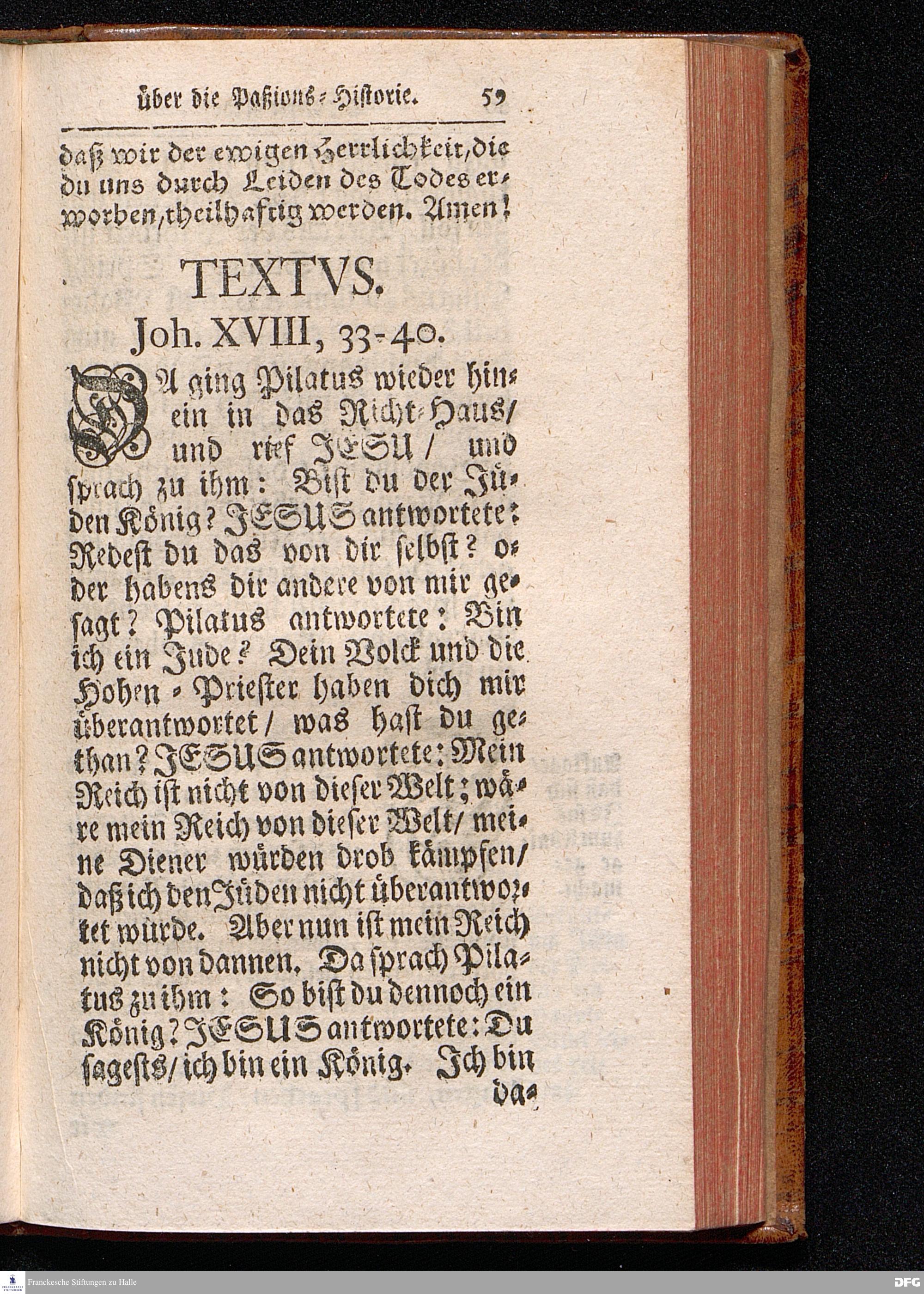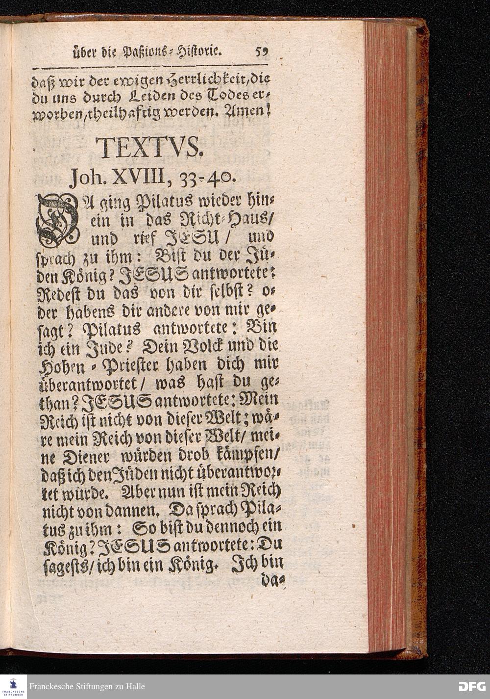 August Hermann Franckens / S.Theol.Prof.& Past.zu St.Ulrich und des Gymnasii Scholarchæ, Oeffentliche Reden über die Paßions=Historie, Wie dieselbe vom Evangelisten Johanne im 18.u.19. Capitel beschrieben ist, gehalten Von Esto mihi bis Ostern 1716. In dem Wäysenhause zu Glaucha an Halle. EDITIO III. HALLE, Gedruckt und verlegt im Wäysenhause, MDCCXXXIII.