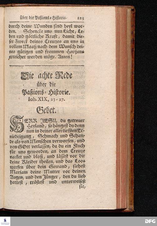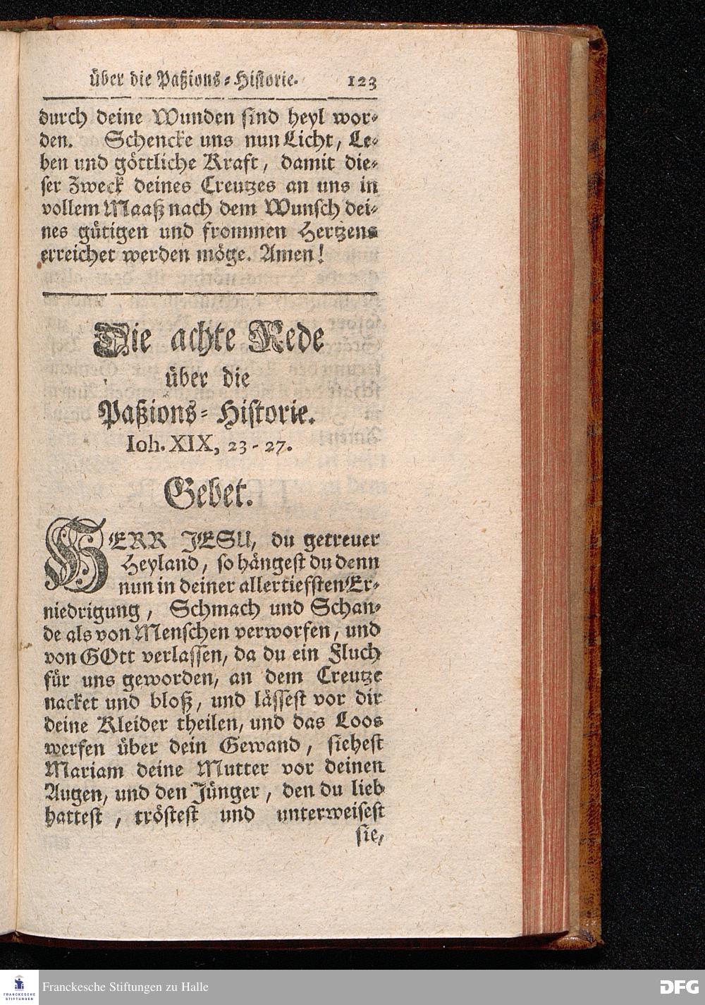 August Hermann Franckens / S.Theol.Prof.& Past.zu St.Ulrich und des Gymnasii Scholarchæ, Oeffentliche Reden über die Paßions=Historie, Wie dieselbe vom Evangelisten Johanne im 18.u.19. Capitel beschrieben ist, gehalten Von Esto mihi bis Ostern 1716. In dem Wäysenhause zu Glaucha an Halle. EDITIO III. HALLE, Gedruckt und verlegt im Wäysenhause, MDCCXXXIII.
