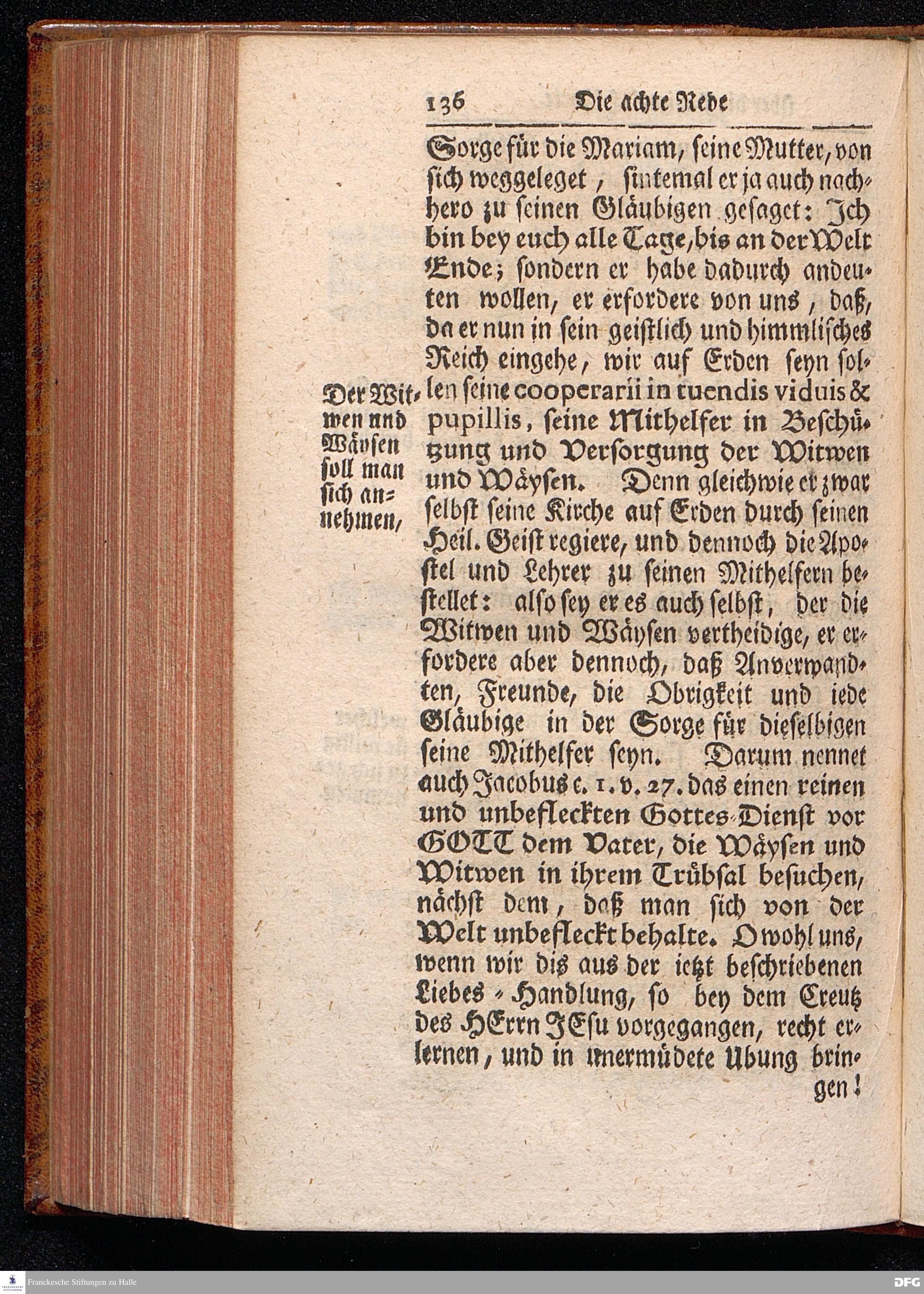 August Hermann Franckens / S.Theol.Prof.& Past.zu St.Ulrich und des Gymnasii Scholarchæ, Oeffentliche Reden über die Paßions=Historie, Wie dieselbe vom Evangelisten Johanne im 18.u.19. Capitel beschrieben ist, gehalten Von Esto mihi bis Ostern 1716. In dem Wäysenhause zu Glaucha an Halle. EDITIO III. HALLE, Gedruckt und verlegt im Wäysenhause, MDCCXXXIII.