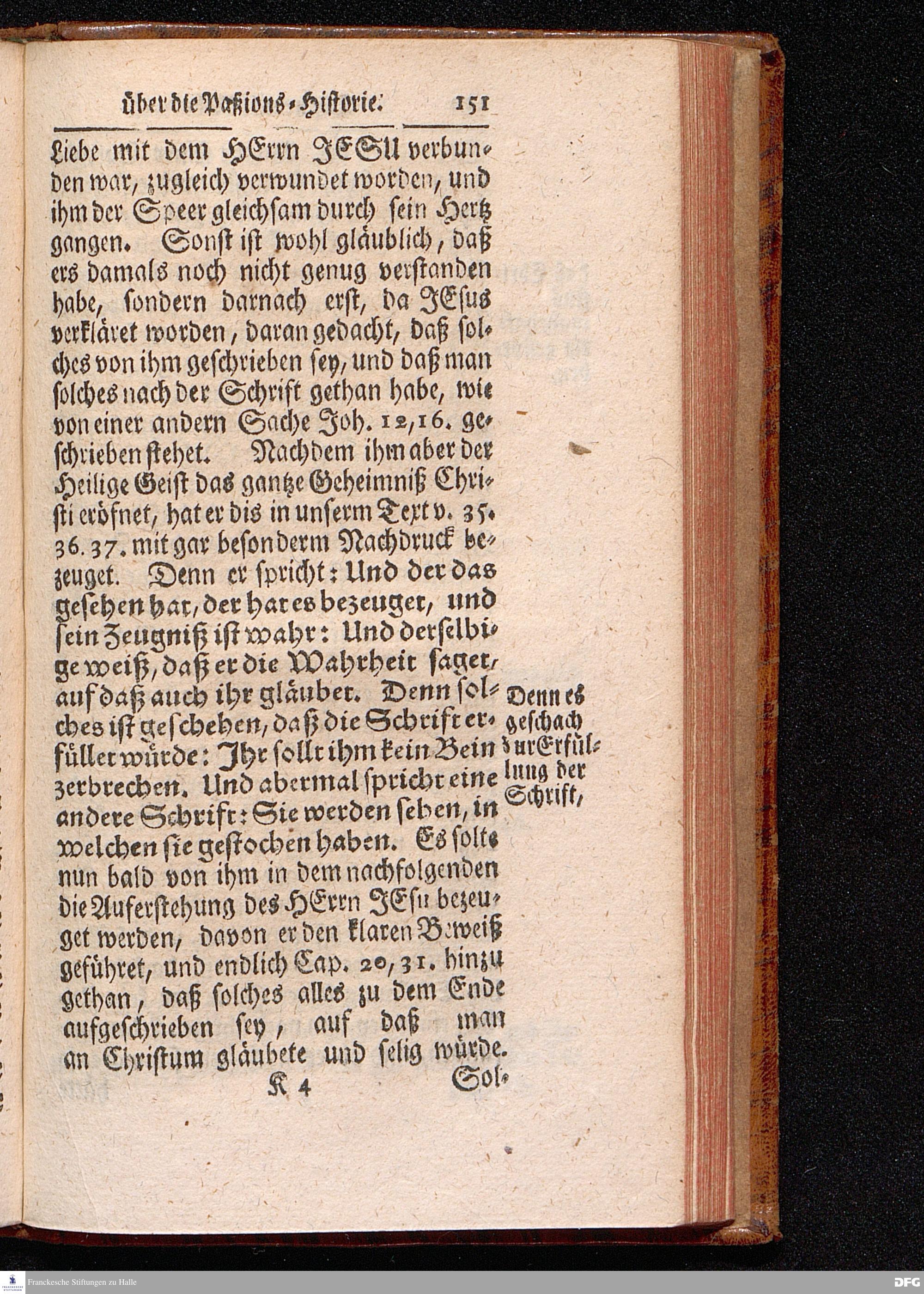 August Hermann Franckens / S.Theol.Prof.& Past.zu St.Ulrich und des Gymnasii Scholarchæ, Oeffentliche Reden über die Paßions=Historie, Wie dieselbe vom Evangelisten Johanne im 18.u.19. Capitel beschrieben ist, gehalten Von Esto mihi bis Ostern 1716. In dem Wäysenhause zu Glaucha an Halle. EDITIO III. HALLE, Gedruckt und verlegt im Wäysenhause, MDCCXXXIII.