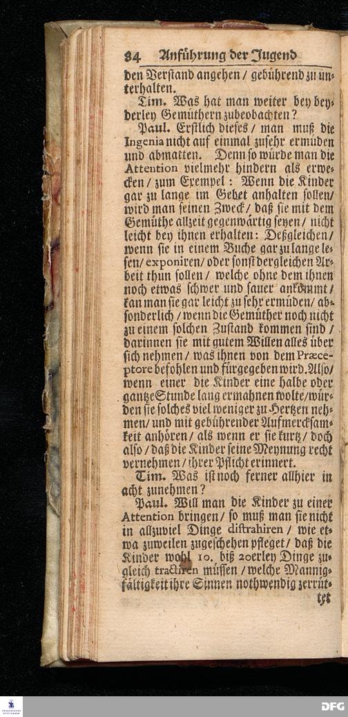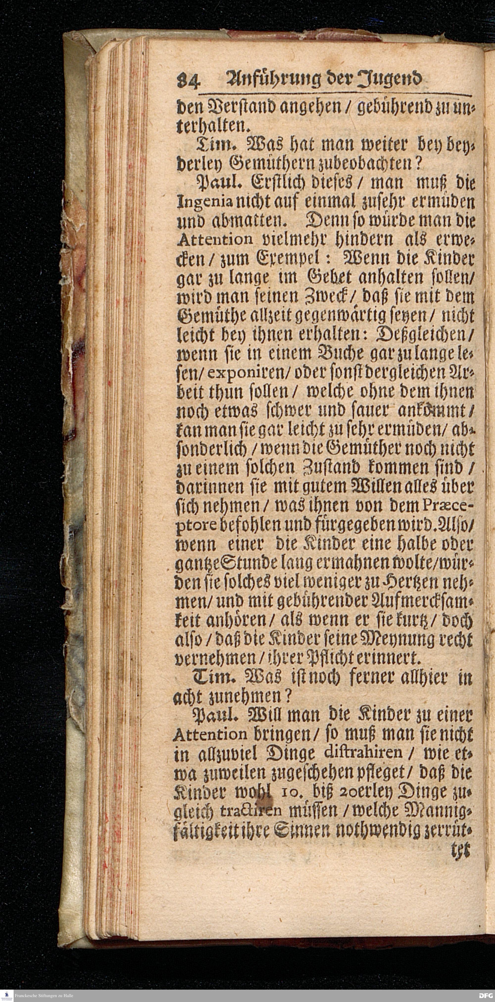 August Hermann Franckens S.Th.Pr.Ord. & Past.Glauch. Unterricht / Wie Die Kinder zur wahren Gottseligkeit und Christlichen Klugheit anzuführen sind / Nunmehro Mit Genehmhaltung des Autoris in zwey Gespräche verfasset von Ambrosius Wirth / jüngsten Suden=Prediger im neuen Spital zu Nürnberg. Christian=Erlang / Gedruckt bey Joh.Friedrich Regelein / In Verlegung des Waysenhauses zu Halle. Anno 1705.
