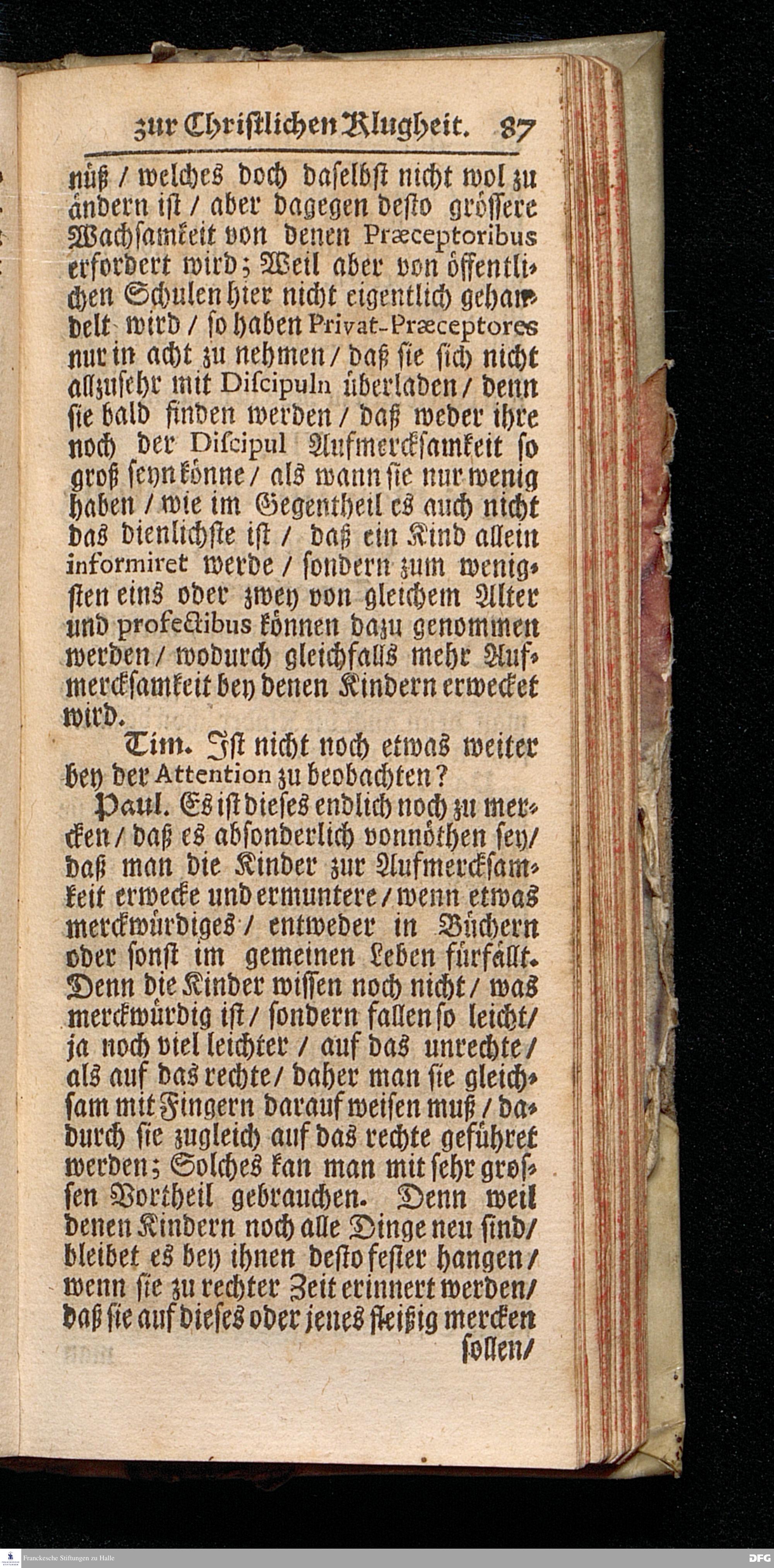 August Hermann Franckens S.Th.Pr.Ord. & Past.Glauch. Unterricht / Wie Die Kinder zur wahren Gottseligkeit und Christlichen Klugheit anzuführen sind / Nunmehro Mit Genehmhaltung des Autoris in zwey Gespräche verfasset von Ambrosius Wirth / jüngsten Suden=Prediger im neuen Spital zu Nürnberg. Christian=Erlang / Gedruckt bey Joh.Friedrich Regelein / In Verlegung des Waysenhauses zu Halle. Anno 1705.