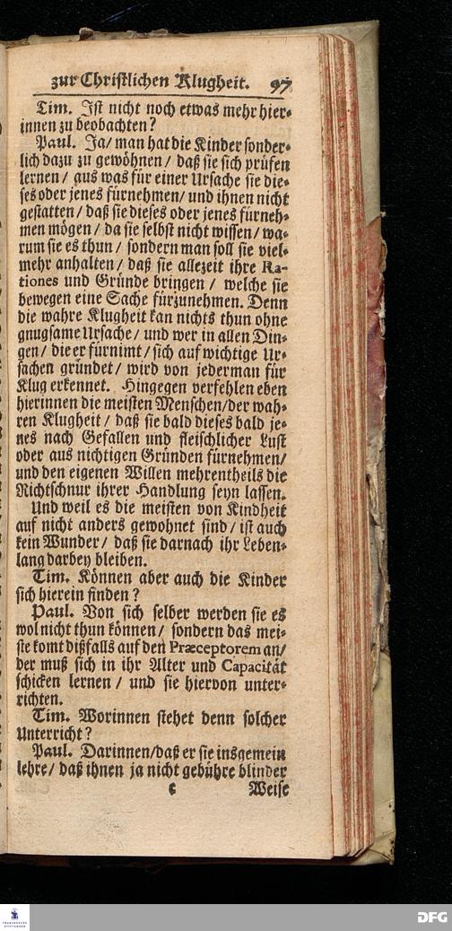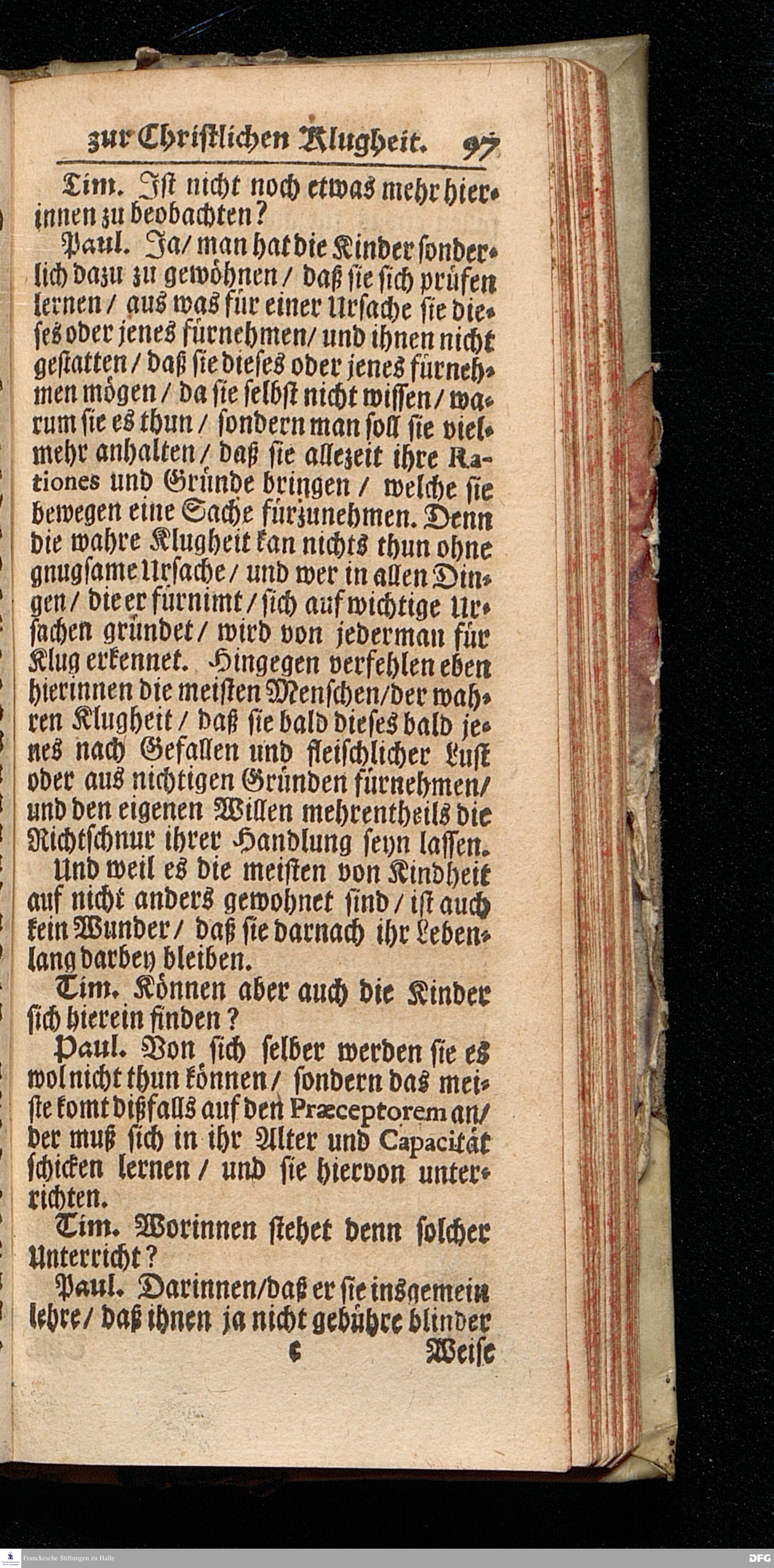 August Hermann Franckens S.Th.Pr.Ord. & Past.Glauch. Unterricht / Wie Die Kinder zur wahren Gottseligkeit und Christlichen Klugheit anzuführen sind / Nunmehro Mit Genehmhaltung des Autoris in zwey Gespräche verfasset von Ambrosius Wirth / jüngsten Suden=Prediger im neuen Spital zu Nürnberg. Christian=Erlang / Gedruckt bey Joh.Friedrich Regelein / In Verlegung des Waysenhauses zu Halle. Anno 1705.