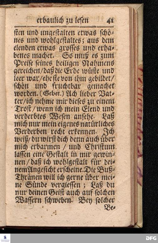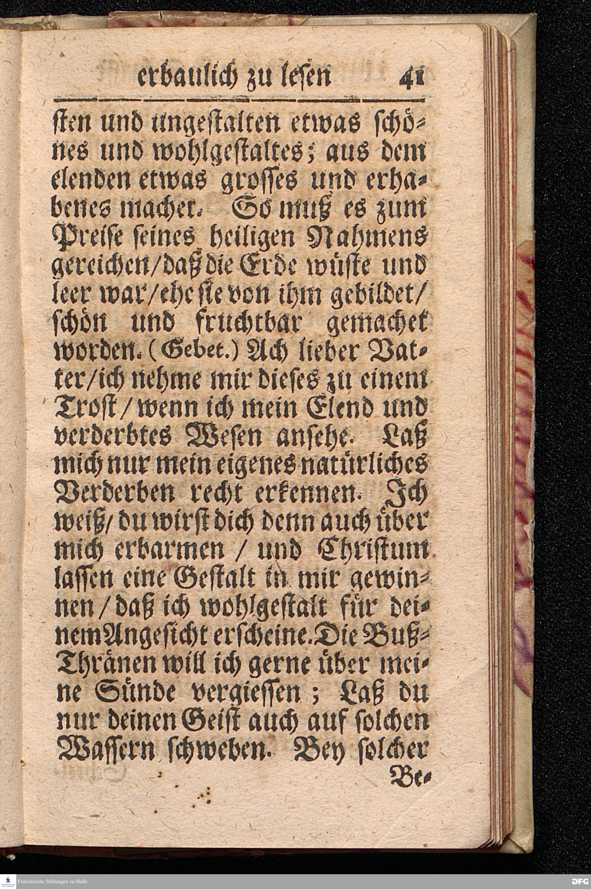 Die Lehre vom Anfang Christliches Lebens / Bestehend in vier Theilen: I. In einer gründlichen Anleitung zu wahrer Buß und Glauben an GOtt. II. In einem einfältigen Unterricht / wie man die H.Schrifft zu seiner wahren Erbauung lesen solle. III. In einer Schrifftmäßigen Anweisung / recht und GOtt gefällig zu beten. IV. In einer kurtzen Prüfung / ob man den wahren lebendigen Glauben an Christum habe oder nicht. Aufs neue verlegt von einer Frauen / so da hertzlich wünscht / daß viele dadurch erbauet werden mögen.