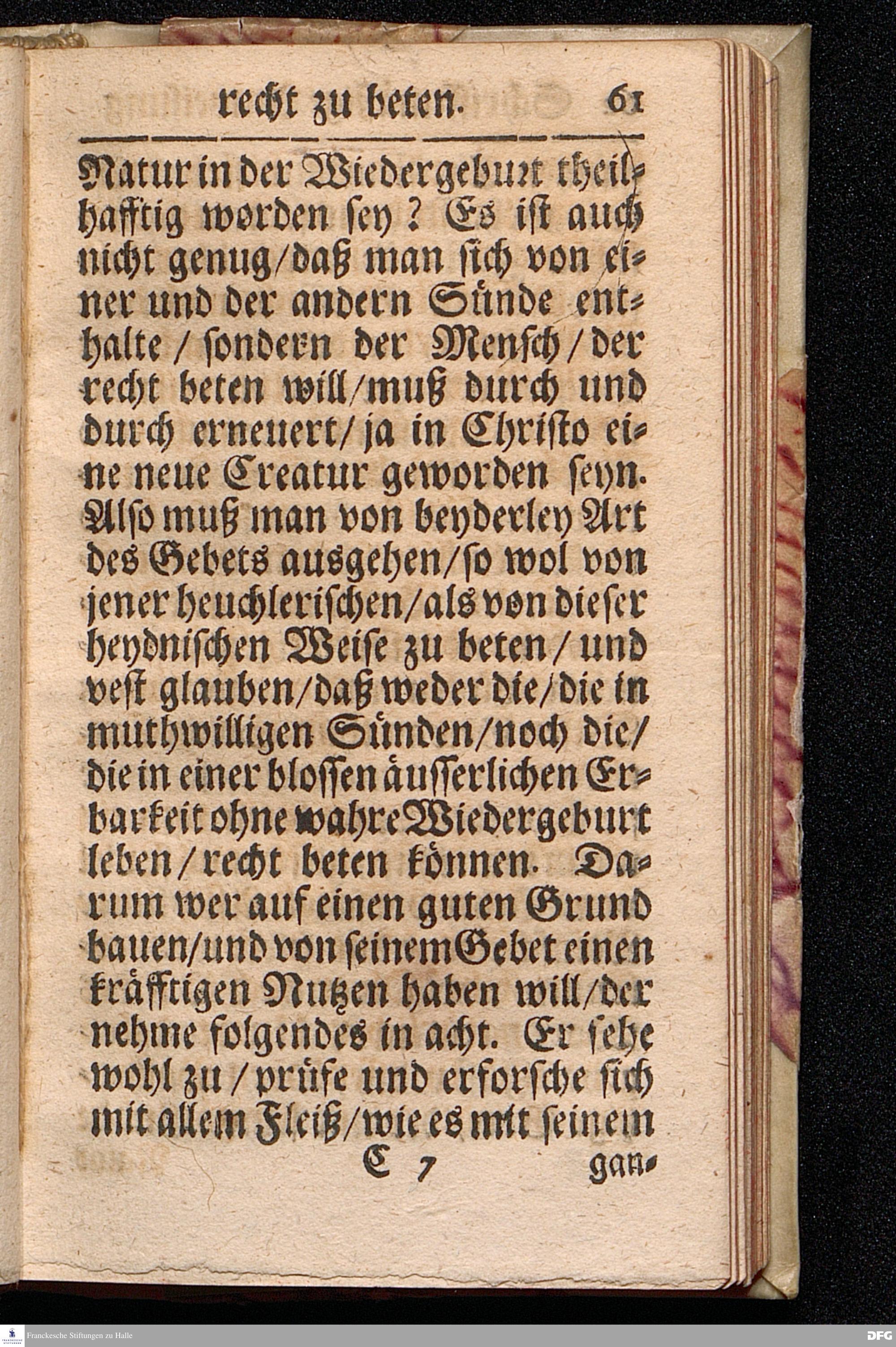 Die Lehre vom Anfang Christliches Lebens / Bestehend in vier Theilen: I. In einer gründlichen Anleitung zu wahrer Buß und Glauben an GOtt. II. In einem einfältigen Unterricht / wie man die H.Schrifft zu seiner wahren Erbauung lesen solle. III. In einer Schrifftmäßigen Anweisung / recht und GOtt gefällig zu beten. IV. In einer kurtzen Prüfung / ob man den wahren lebendigen Glauben an Christum habe oder nicht. Aufs neue verlegt von einer Frauen / so da hertzlich wünscht / daß viele dadurch erbauet werden mögen.