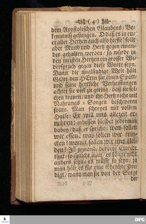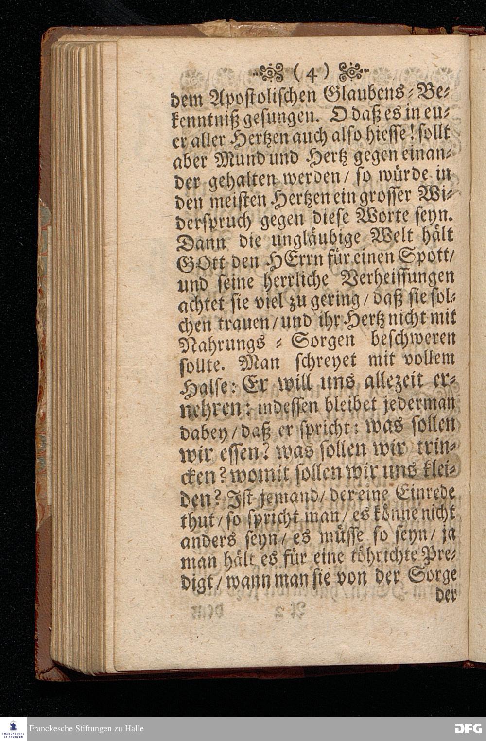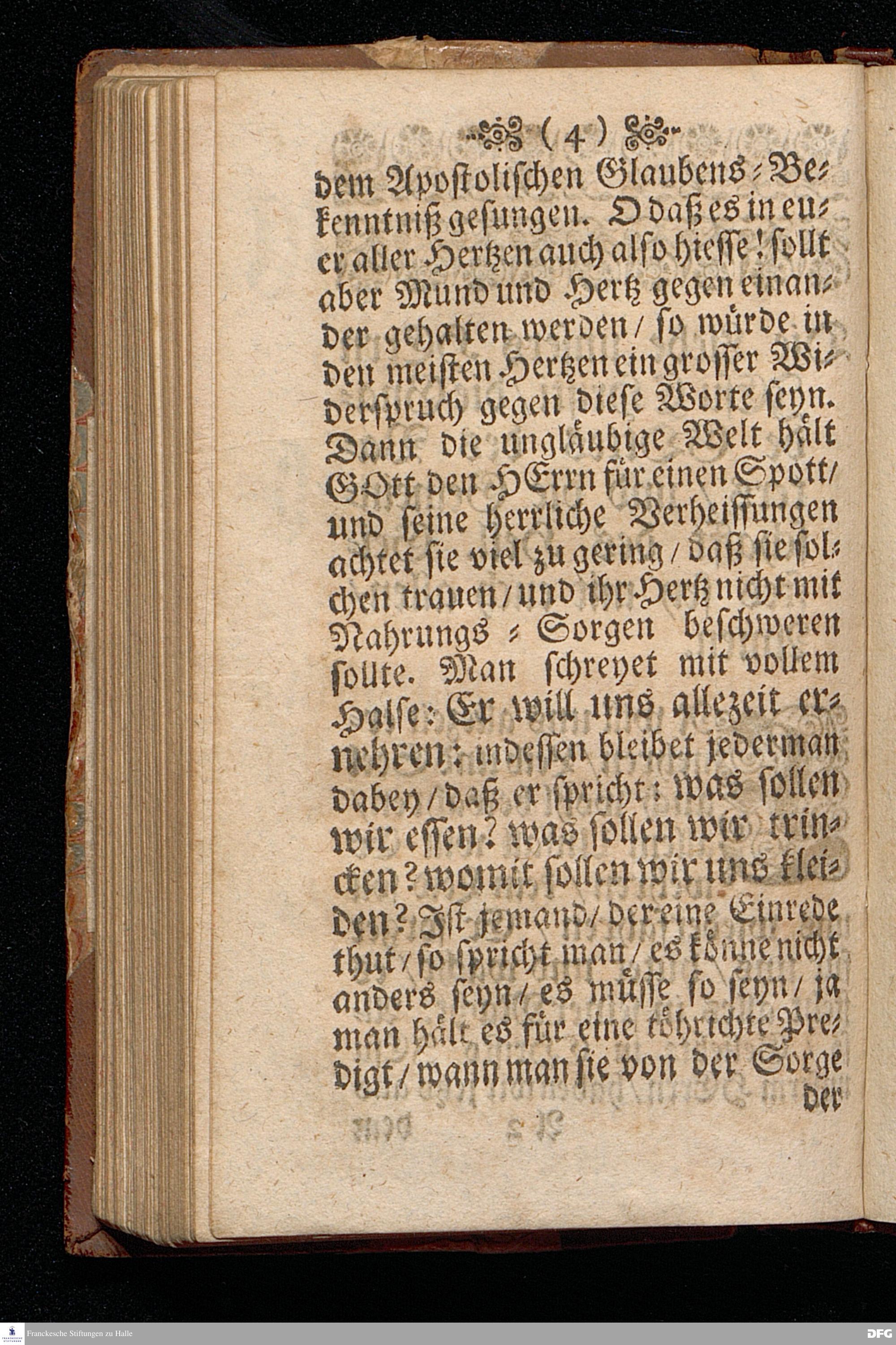 Die Beschwerung des Hertzens Mit der Sorge der Nahrung / In einer Predigt Uber das Evangelium Matth.VI, vers.24==34. Am 15.Sonntag nach Trinitatis Anno 1697, In der St.Georgen=Kirche zu Glaucha an Halle vorgestellet von M.August Hermann Francken / Gr.& OO.LL.P.P.& P.Glauch. Halle / druckts Christian Henckel / 1698.