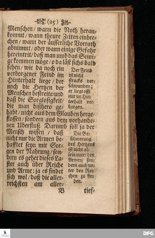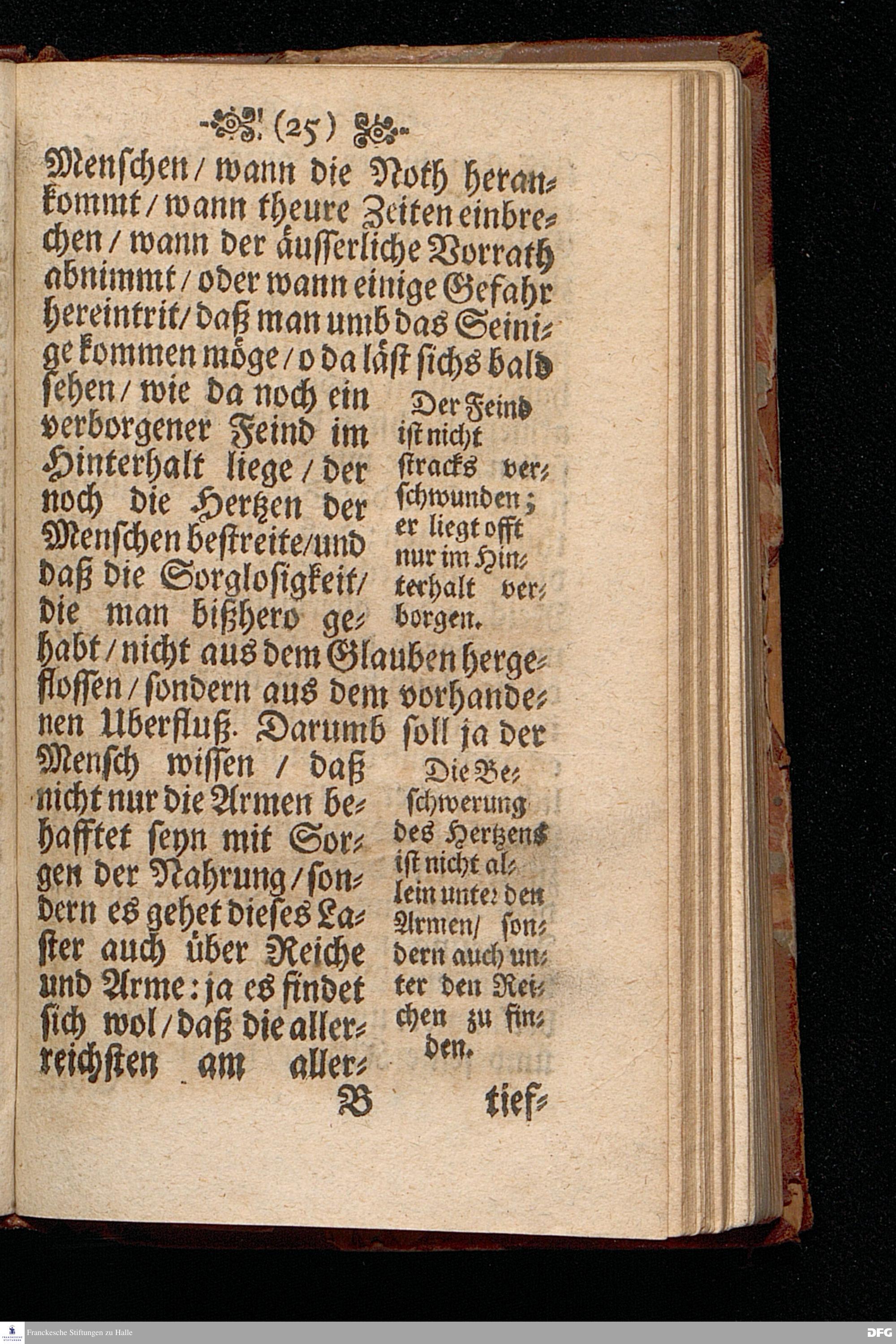 Die Beschwerung des Hertzens Mit der Sorge der Nahrung / In einer Predigt Uber das Evangelium Matth.VI, vers.24==34. Am 15.Sonntag nach Trinitatis Anno 1697, In der St.Georgen=Kirche zu Glaucha an Halle vorgestellet von M.August Hermann Francken / Gr.& OO.LL.P.P.& P.Glauch. Halle / druckts Christian Henckel / 1698.