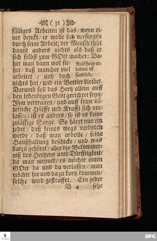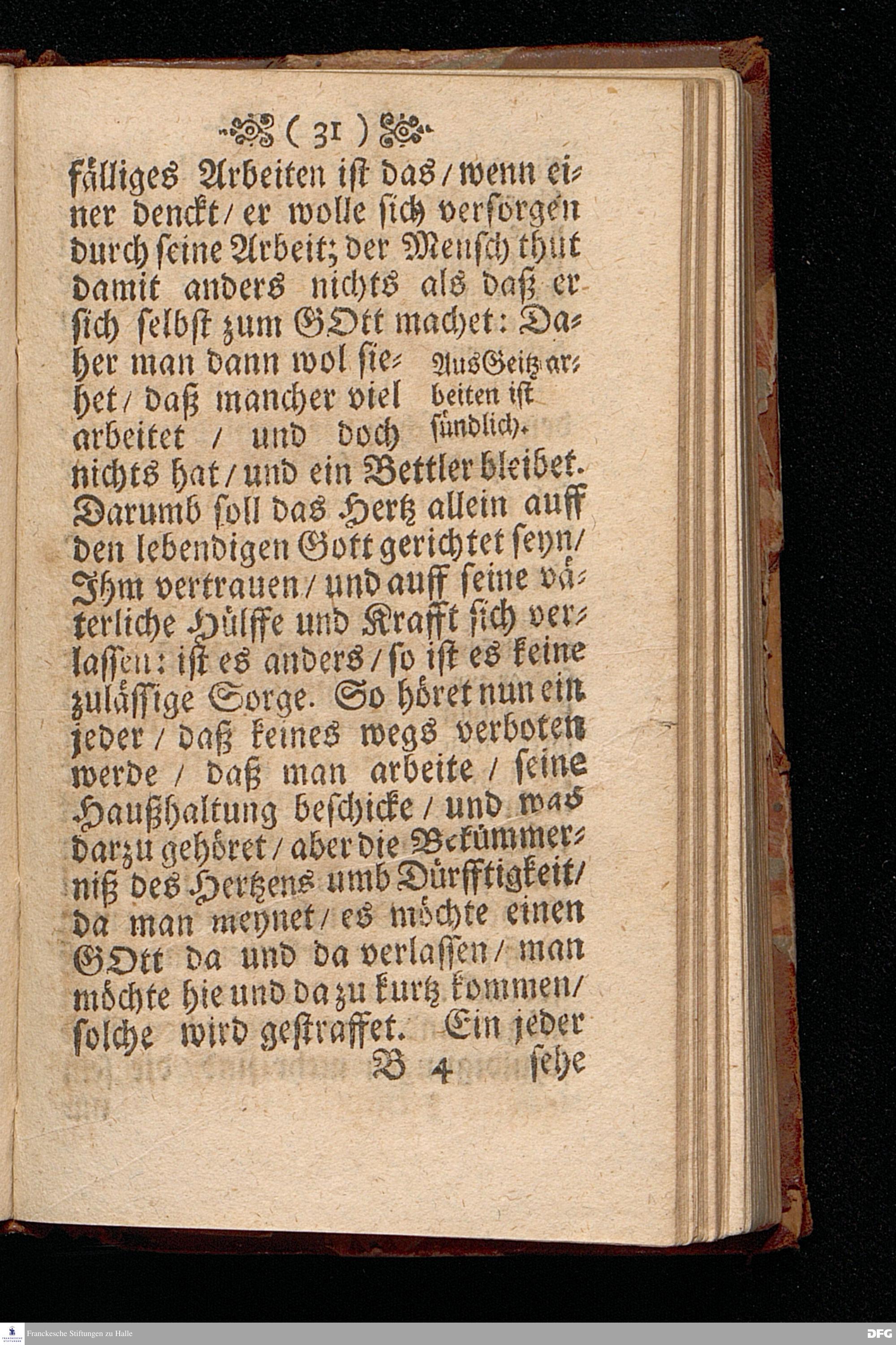 Die Beschwerung des Hertzens Mit der Sorge der Nahrung / In einer Predigt Uber das Evangelium Matth.VI, vers.24==34. Am 15.Sonntag nach Trinitatis Anno 1697, In der St.Georgen=Kirche zu Glaucha an Halle vorgestellet von M.August Hermann Francken / Gr.& OO.LL.P.P.& P.Glauch. Halle / druckts Christian Henckel / 1698.