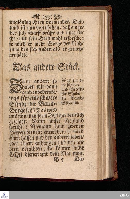 Die Beschwerung des Hertzens Mit der Sorge der Nahrung / In einer Predigt Uber das Evangelium Matth.VI, vers.24==34. Am 15.Sonntag nach Trinitatis Anno 1697, In der St.Georgen=Kirche zu Glaucha an Halle vorgestellet von M.August Hermann Francken / Gr.& OO.LL.P.P.& P.Glauch. Halle / druckts Christian Henckel / 1698.