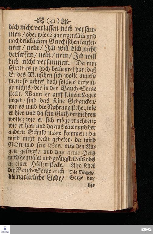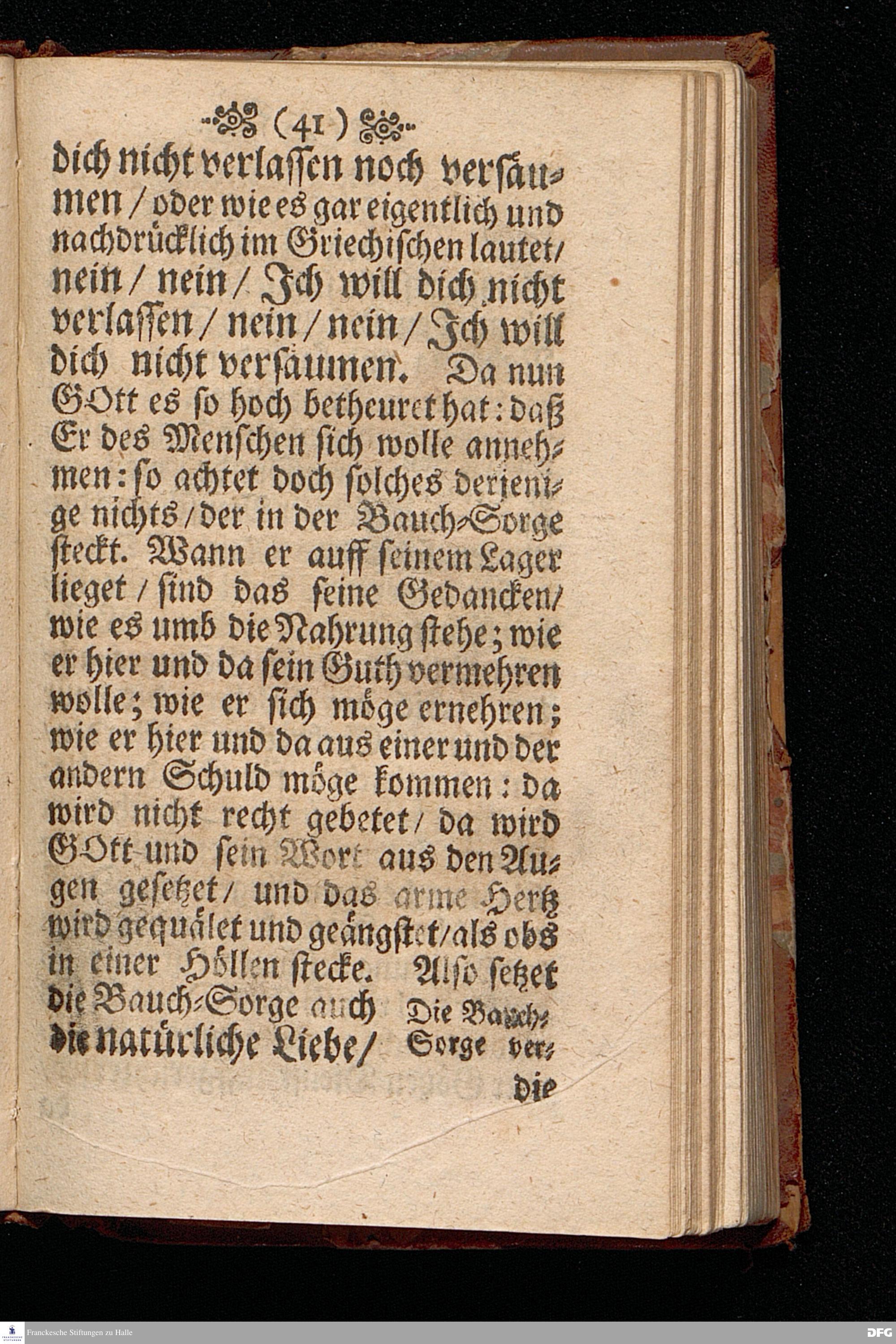 Die Beschwerung des Hertzens Mit der Sorge der Nahrung / In einer Predigt Uber das Evangelium Matth.VI, vers.24==34. Am 15.Sonntag nach Trinitatis Anno 1697, In der St.Georgen=Kirche zu Glaucha an Halle vorgestellet von M.August Hermann Francken / Gr.& OO.LL.P.P.& P.Glauch. Halle / druckts Christian Henckel / 1698.