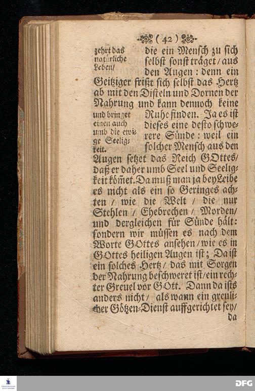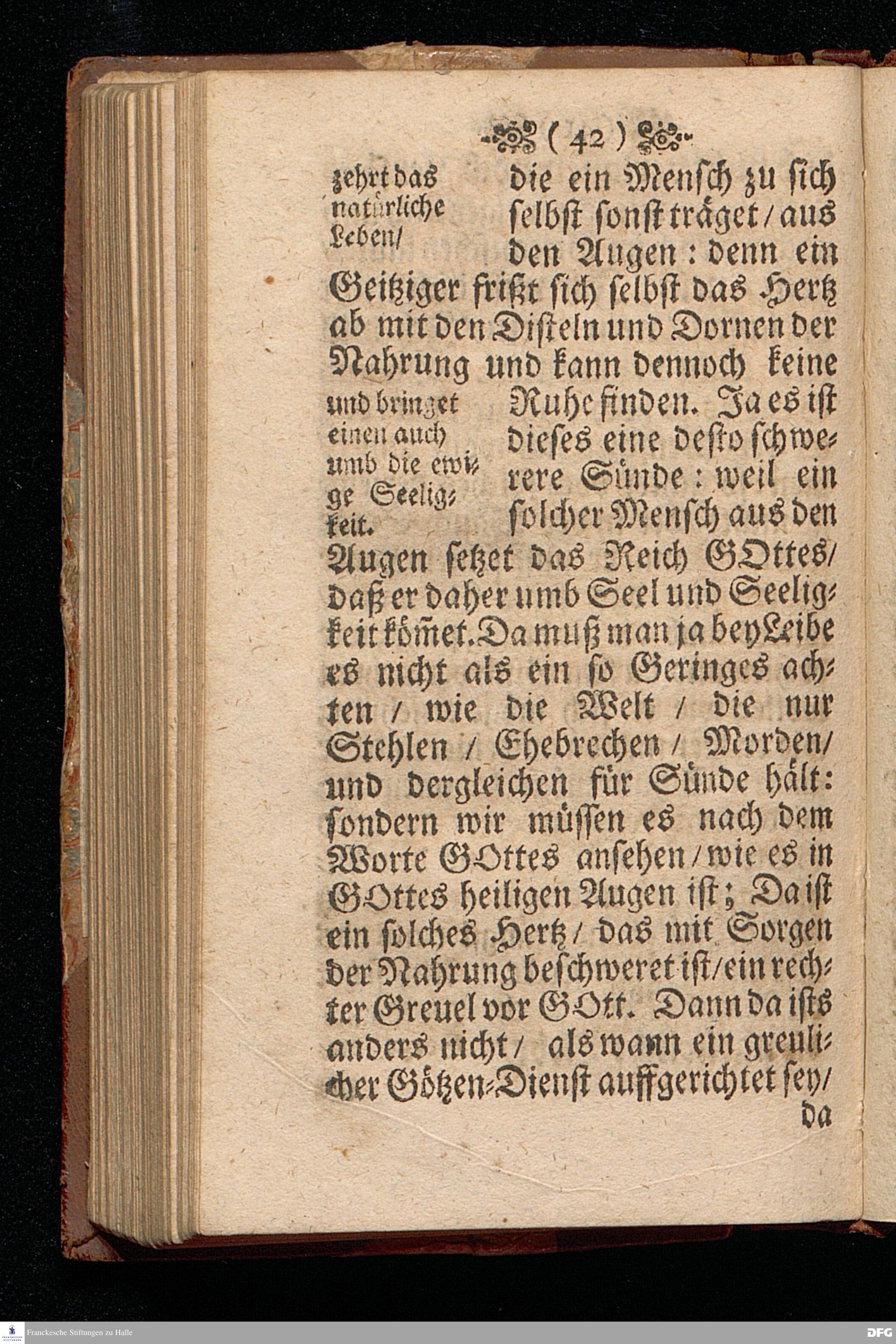 Die Beschwerung des Hertzens Mit der Sorge der Nahrung / In einer Predigt Uber das Evangelium Matth.VI, vers.24==34. Am 15.Sonntag nach Trinitatis Anno 1697, In der St.Georgen=Kirche zu Glaucha an Halle vorgestellet von M.August Hermann Francken / Gr.& OO.LL.P.P.& P.Glauch. Halle / druckts Christian Henckel / 1698.