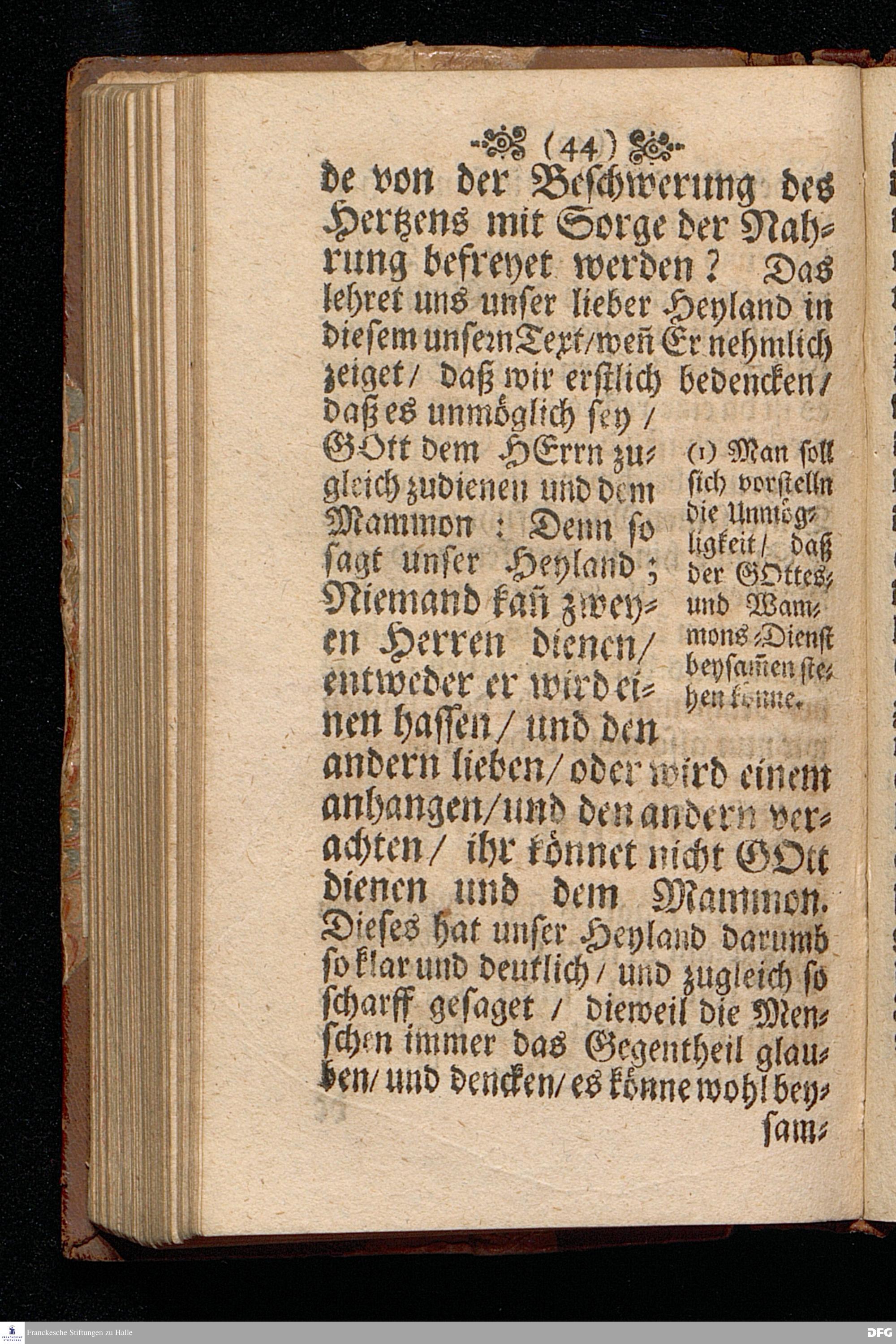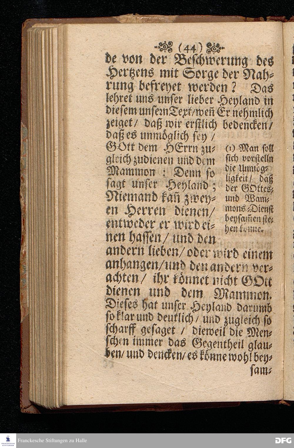 Die Beschwerung des Hertzens Mit der Sorge der Nahrung / In einer Predigt Uber das Evangelium Matth.VI, vers.24==34. Am 15.Sonntag nach Trinitatis Anno 1697, In der St.Georgen=Kirche zu Glaucha an Halle vorgestellet von M.August Hermann Francken / Gr.& OO.LL.P.P.& P.Glauch. Halle / druckts Christian Henckel / 1698.