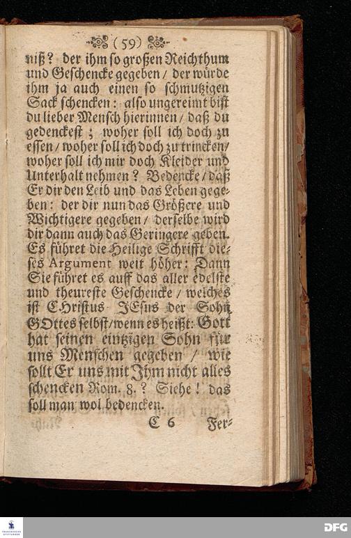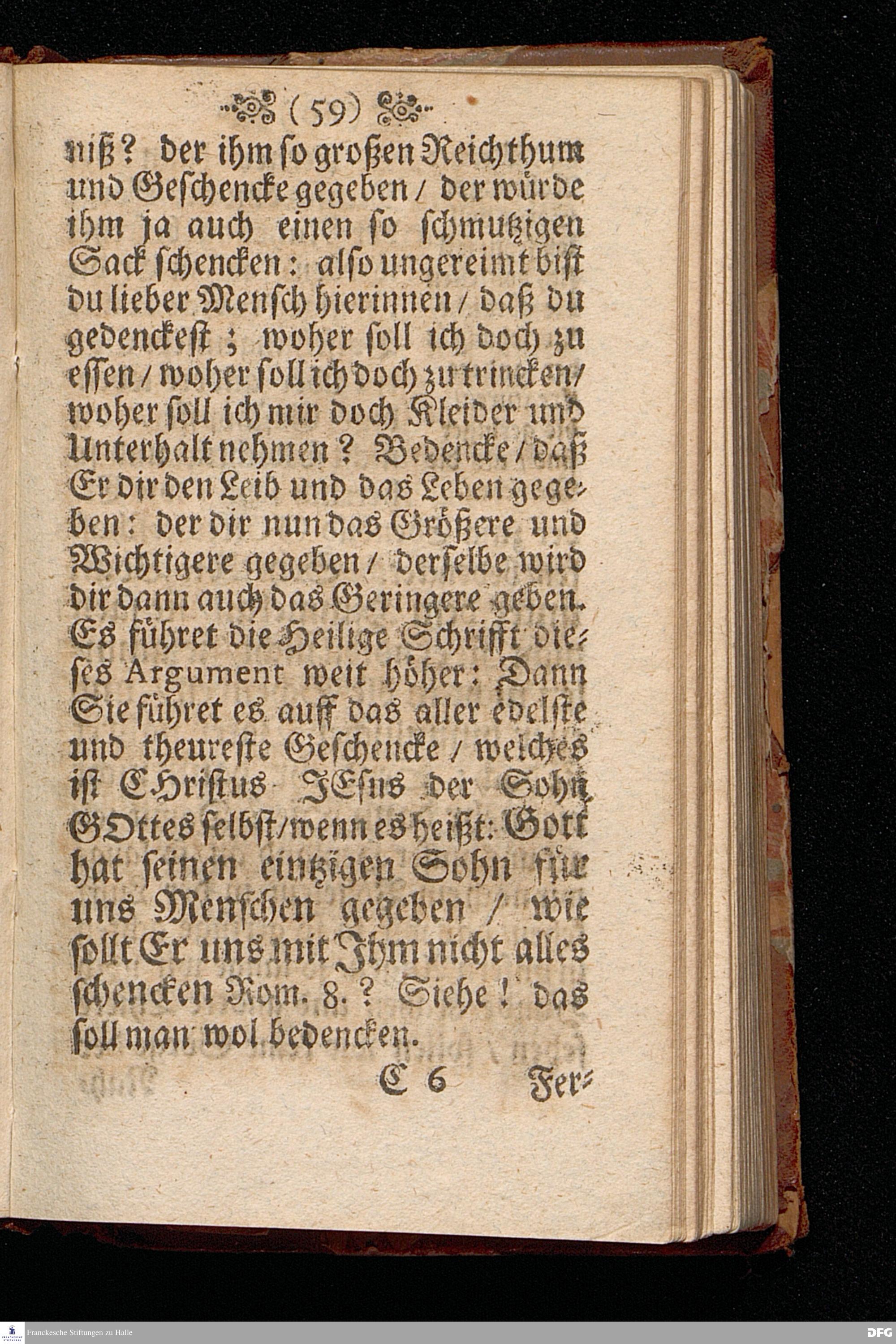 Die Beschwerung des Hertzens Mit der Sorge der Nahrung / In einer Predigt Uber das Evangelium Matth.VI, vers.24==34. Am 15.Sonntag nach Trinitatis Anno 1697, In der St.Georgen=Kirche zu Glaucha an Halle vorgestellet von M.August Hermann Francken / Gr.& OO.LL.P.P.& P.Glauch. Halle / druckts Christian Henckel / 1698.