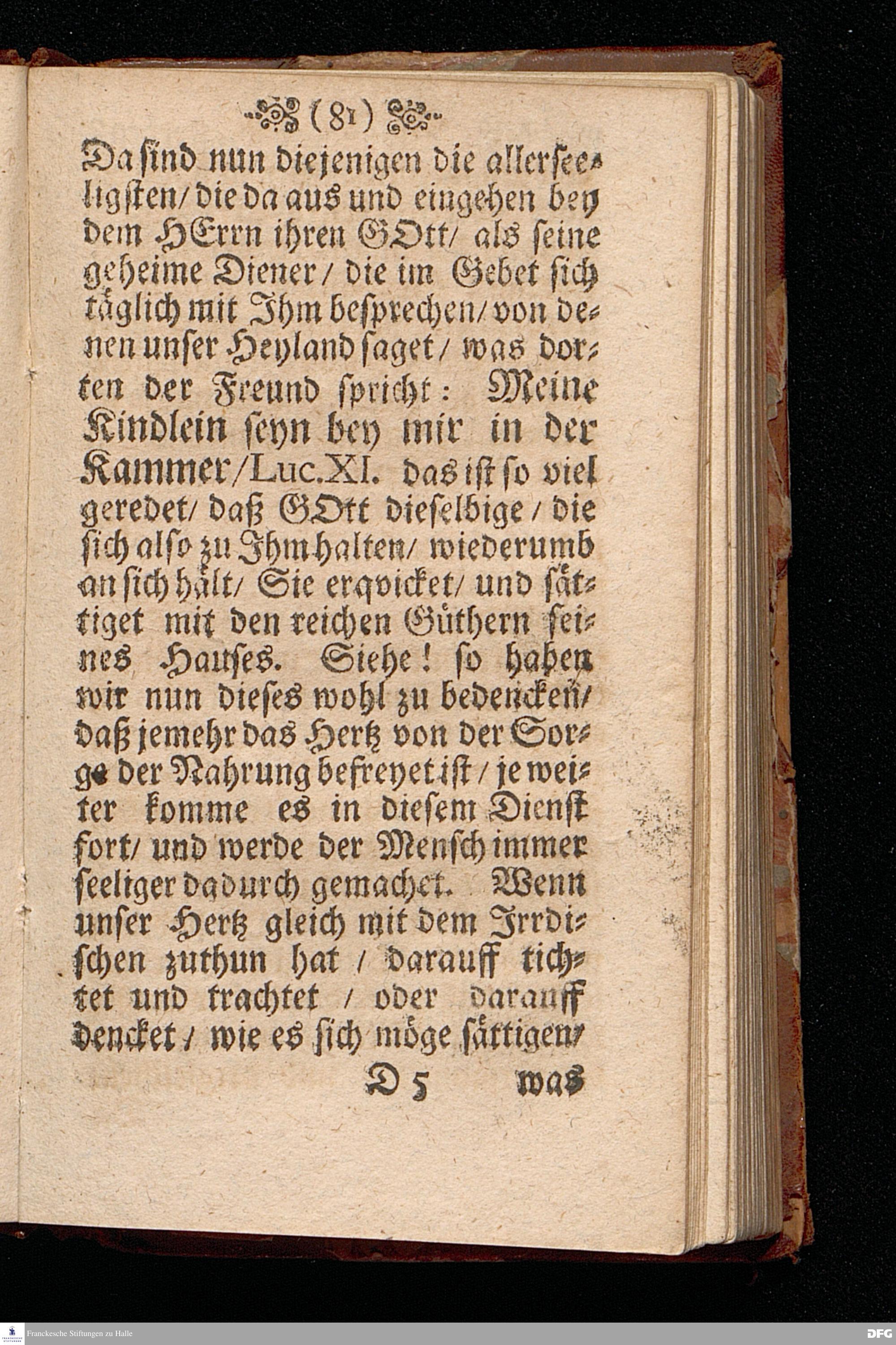 Die Beschwerung des Hertzens Mit der Sorge der Nahrung / In einer Predigt Uber das Evangelium Matth.VI, vers.24==34. Am 15.Sonntag nach Trinitatis Anno 1697, In der St.Georgen=Kirche zu Glaucha an Halle vorgestellet von M.August Hermann Francken / Gr.& OO.LL.P.P.& P.Glauch. Halle / druckts Christian Henckel / 1698.