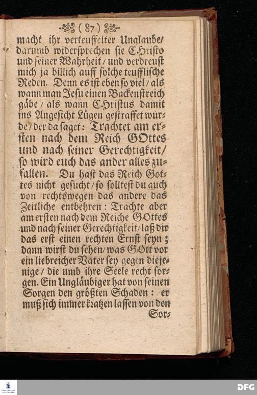 Die Beschwerung des Hertzens Mit der Sorge der Nahrung / In einer Predigt Uber das Evangelium Matth.VI, vers.24==34. Am 15.Sonntag nach Trinitatis Anno 1697, In der St.Georgen=Kirche zu Glaucha an Halle vorgestellet von M.August Hermann Francken / Gr.& OO.LL.P.P.& P.Glauch. Halle / druckts Christian Henckel / 1698.