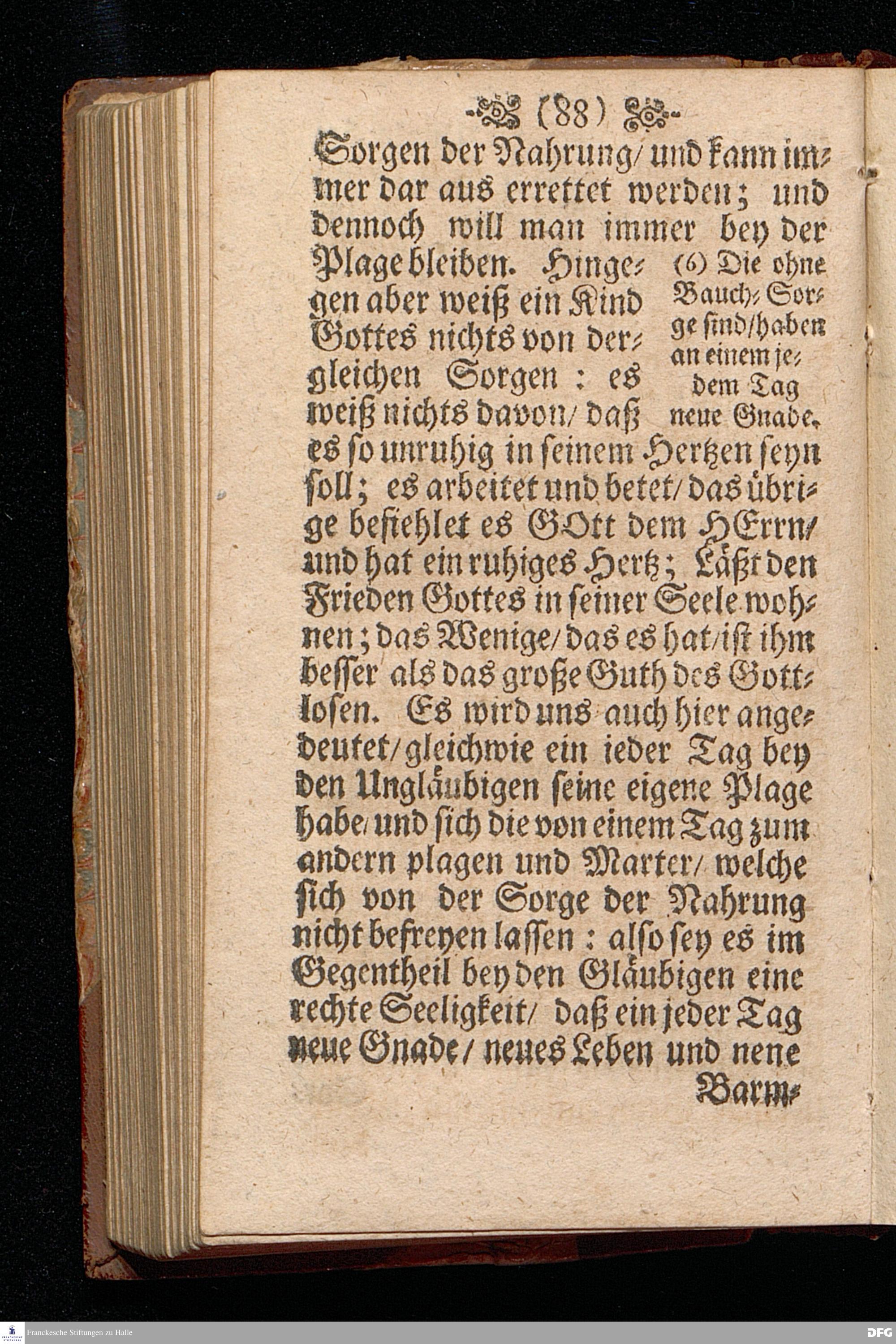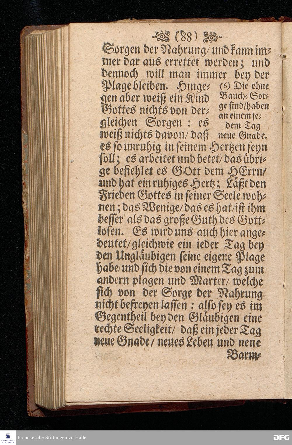 Die Beschwerung des Hertzens Mit der Sorge der Nahrung / In einer Predigt Uber das Evangelium Matth.VI, vers.24==34. Am 15.Sonntag nach Trinitatis Anno 1697, In der St.Georgen=Kirche zu Glaucha an Halle vorgestellet von M.August Hermann Francken / Gr.& OO.LL.P.P.& P.Glauch. Halle / druckts Christian Henckel / 1698.