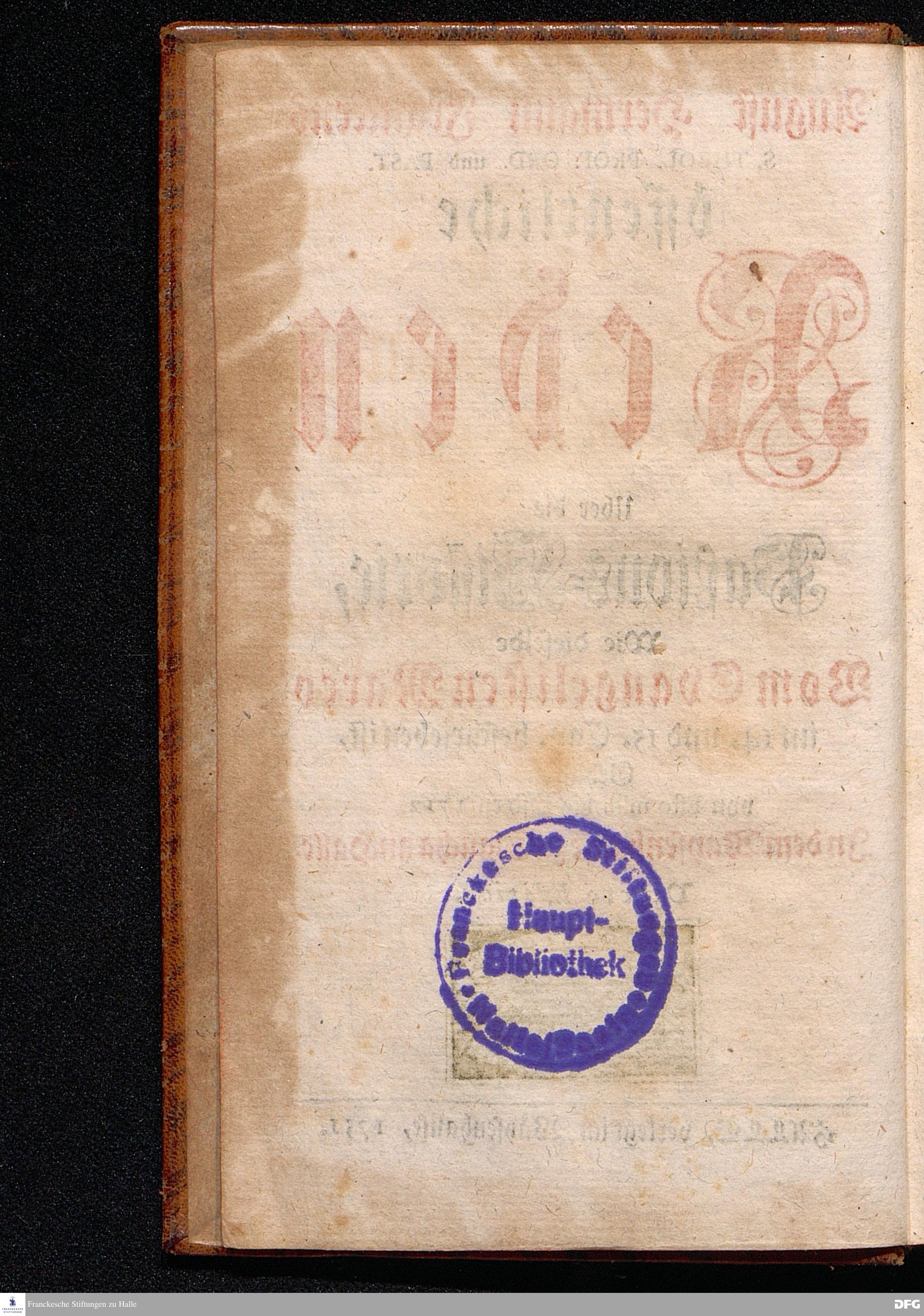 August Hermann Franckens S.THEOL.PROF.ORD.und PAST. Öffentliche Reden Uber die Paßions=Historie, Wie dieselbe Vom Evangelisten Marco im 14. und 15. Cap. beschrieben ist, Gehalten von Esto mihi bis Ostern 1712. In dem Waysenhause zu Glaucha an Halle. Vierte Edition. HALLE, verlegt im Wäysenhause, 1751.