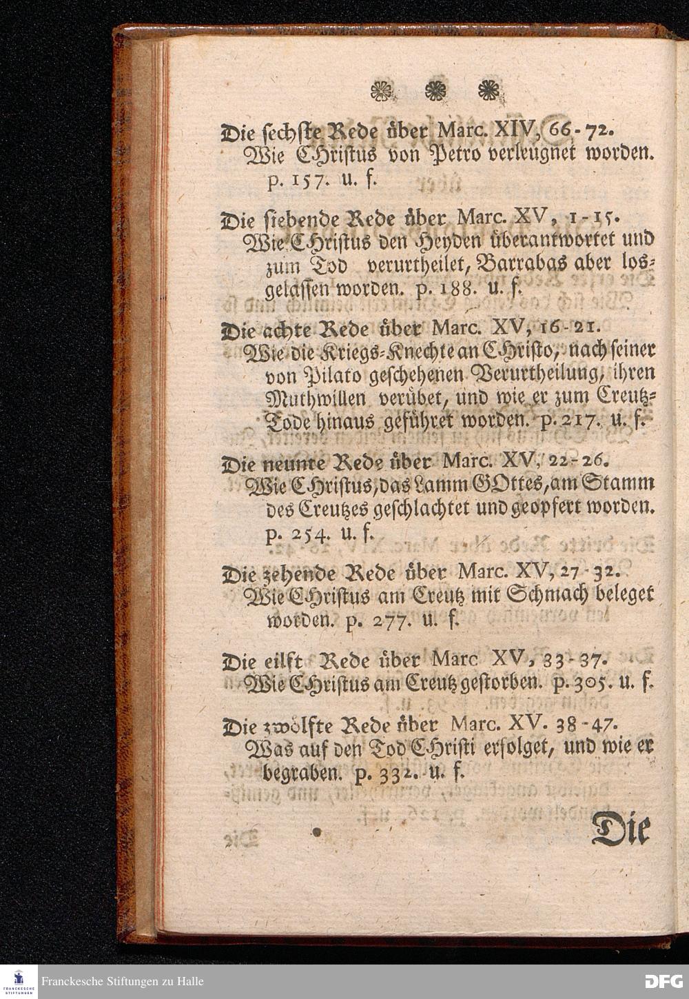 August Hermann Franckens S.THEOL.PROF.ORD.und PAST. Öffentliche Reden Uber die Paßions=Historie, Wie dieselbe Vom Evangelisten Marco im 14. und 15. Cap. beschrieben ist, Gehalten von Esto mihi bis Ostern 1712. In dem Waysenhause zu Glaucha an Halle. Vierte Edition. HALLE, verlegt im Wäysenhause, 1751.
