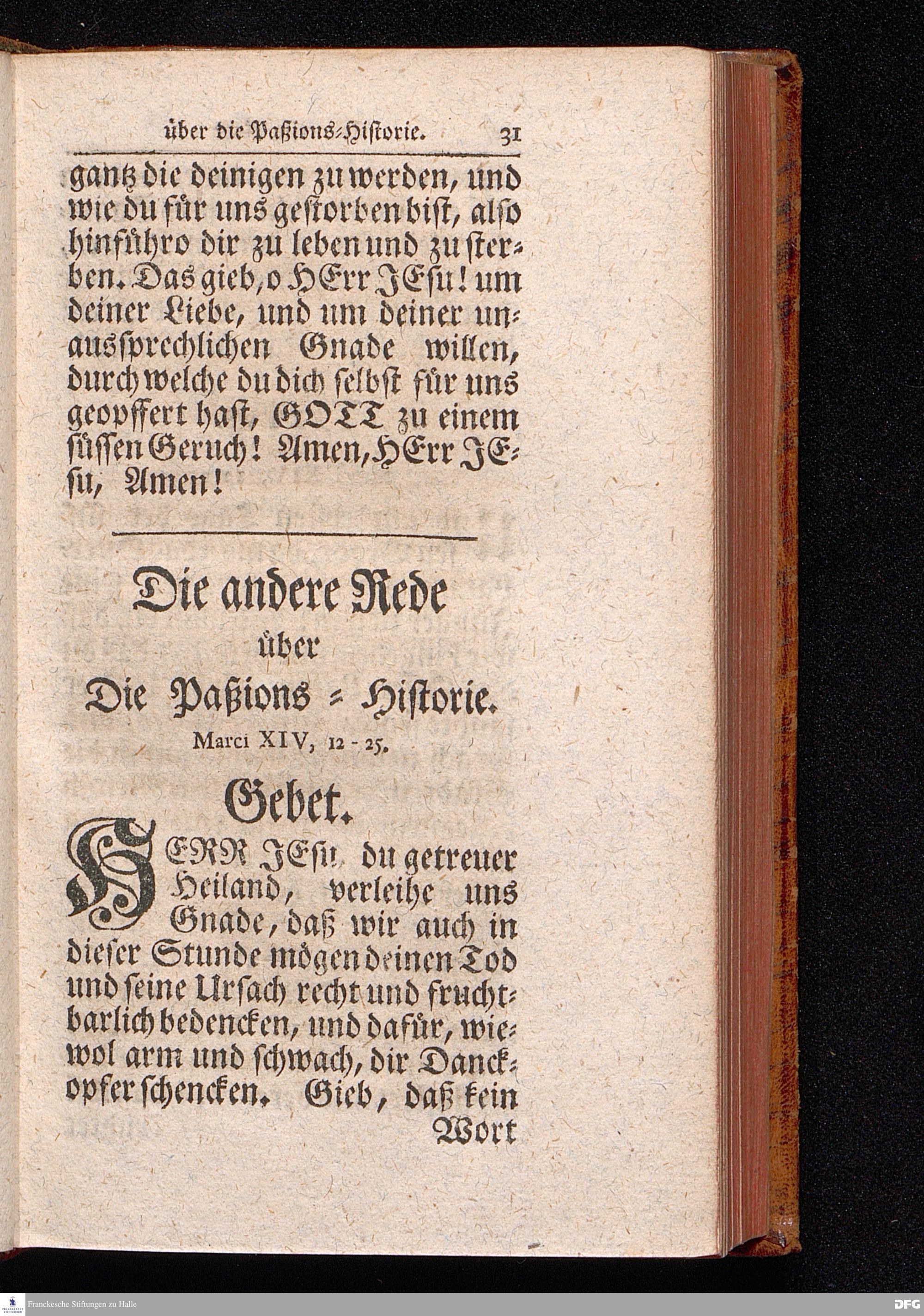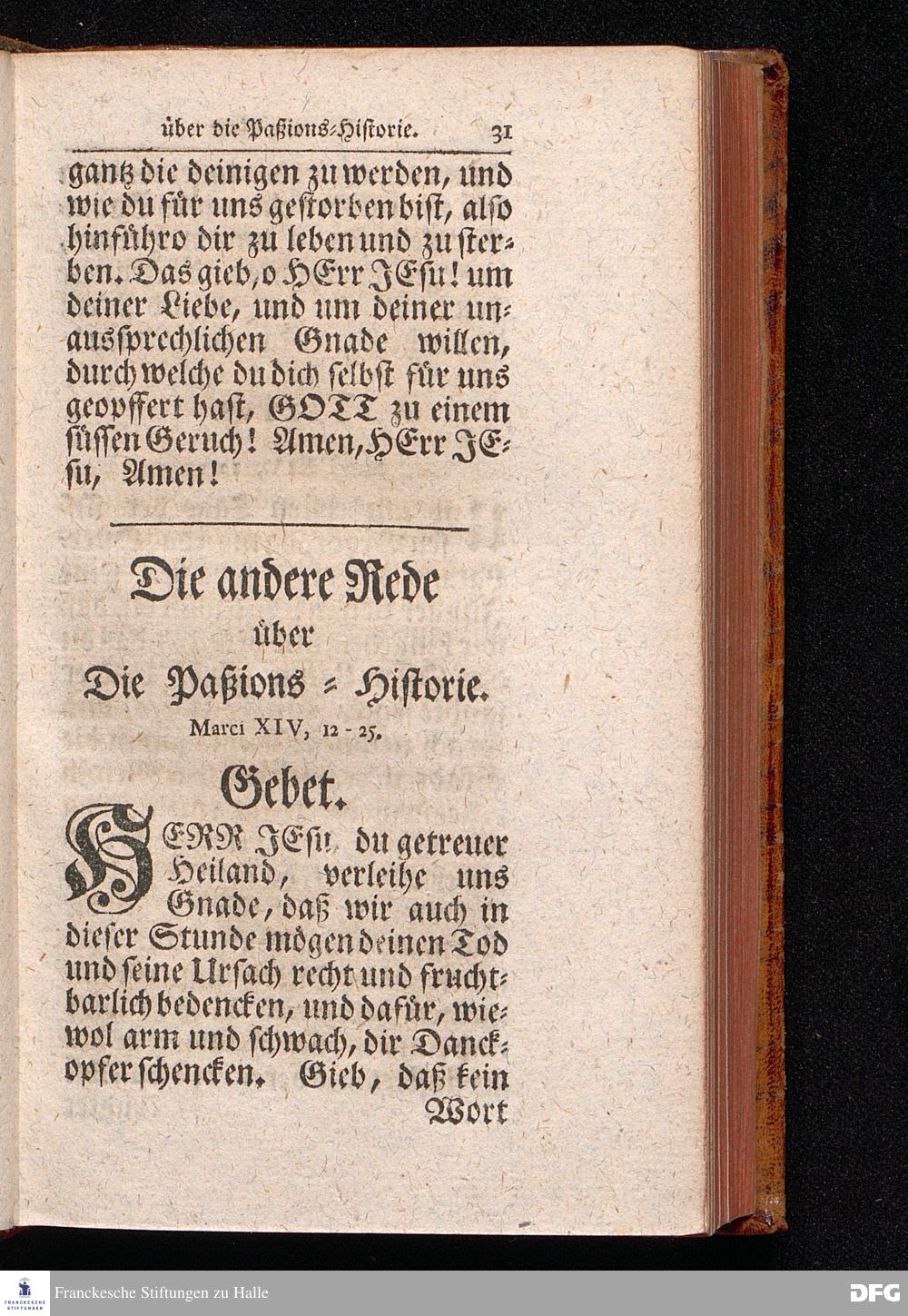 August Hermann Franckens S.THEOL.PROF.ORD.und PAST. Öffentliche Reden Uber die Paßions=Historie, Wie dieselbe Vom Evangelisten Marco im 14. und 15. Cap. beschrieben ist, Gehalten von Esto mihi bis Ostern 1712. In dem Waysenhause zu Glaucha an Halle. Vierte Edition. HALLE, verlegt im Wäysenhause, 1751.