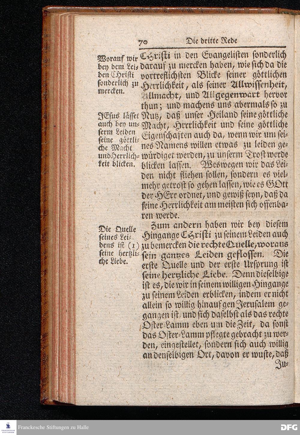 August Hermann Franckens S.THEOL.PROF.ORD.und PAST. Öffentliche Reden Uber die Paßions=Historie, Wie dieselbe Vom Evangelisten Marco im 14. und 15. Cap. beschrieben ist, Gehalten von Esto mihi bis Ostern 1712. In dem Waysenhause zu Glaucha an Halle. Vierte Edition. HALLE, verlegt im Wäysenhause, 1751.