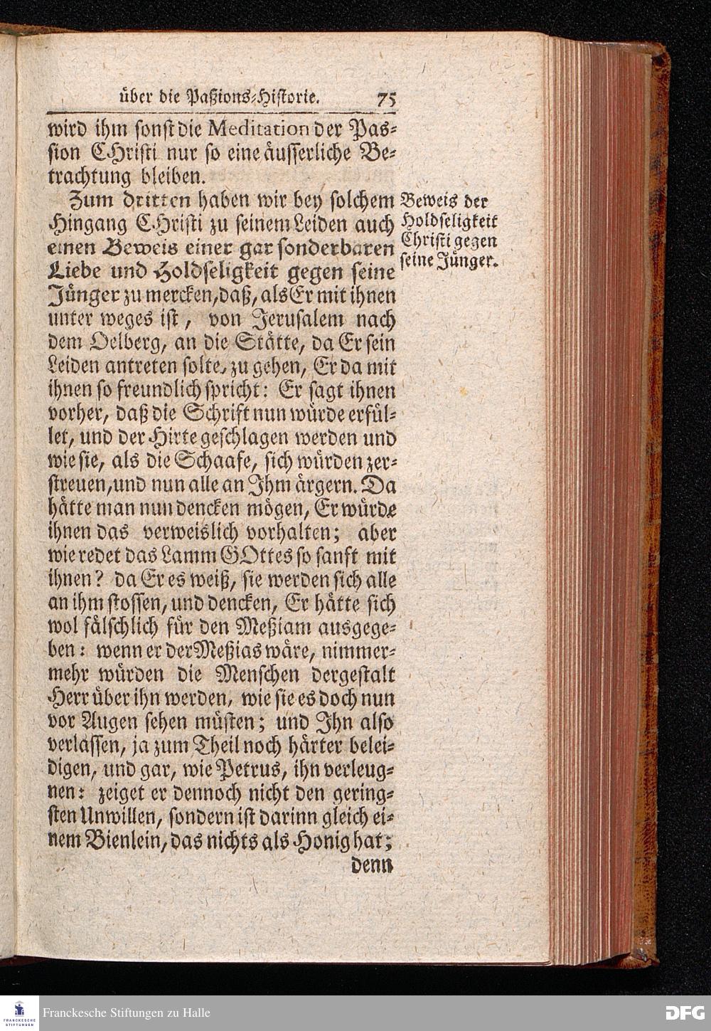 August Hermann Franckens S.THEOL.PROF.ORD.und PAST. Öffentliche Reden Uber die Paßions=Historie, Wie dieselbe Vom Evangelisten Marco im 14. und 15. Cap. beschrieben ist, Gehalten von Esto mihi bis Ostern 1712. In dem Waysenhause zu Glaucha an Halle. Vierte Edition. HALLE, verlegt im Wäysenhause, 1751.