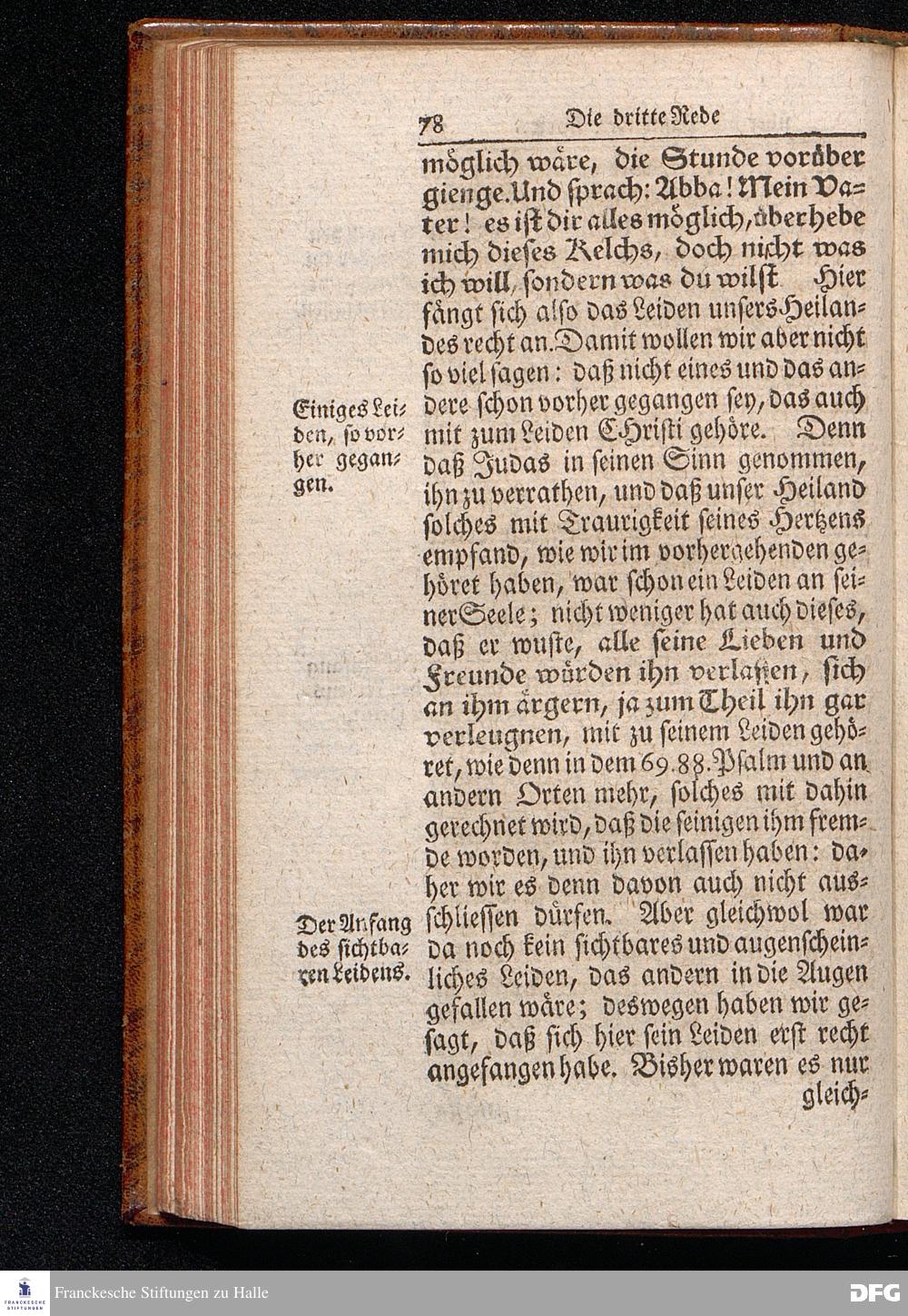 August Hermann Franckens S.THEOL.PROF.ORD.und PAST. Öffentliche Reden Uber die Paßions=Historie, Wie dieselbe Vom Evangelisten Marco im 14. und 15. Cap. beschrieben ist, Gehalten von Esto mihi bis Ostern 1712. In dem Waysenhause zu Glaucha an Halle. Vierte Edition. HALLE, verlegt im Wäysenhause, 1751.