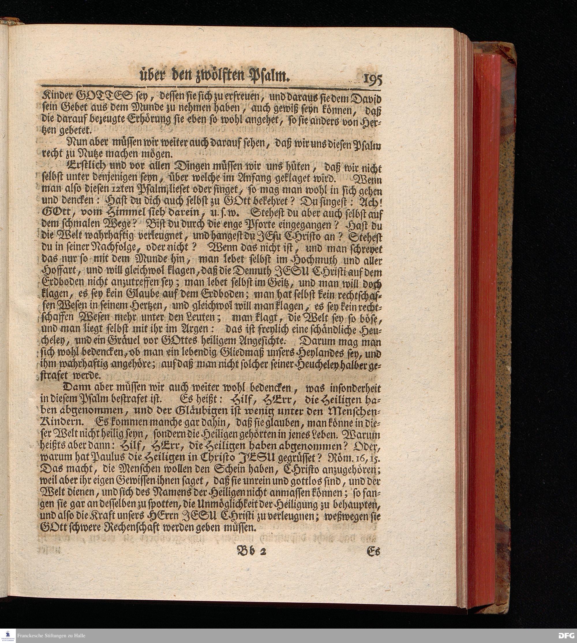 August Hermann Franckens, Weyl.Prof.Theol.Past.Ulr.und Schol. Erklärung Der Psalmen Davids; Erster [und] Anderer Theil, Mit einer Vorrede herausgegeben Von Gotthilf August Francken, S.S.Theol.Doct.und Prof.Publ.Ord.der ersten Dioeces des Saal-Creyses Inspectore und Pred.zur L.Fr. Andere Auflage. HALLE, in Verlegung des Wäysen=Hauses MDCCXLIII--MDCCXLV.