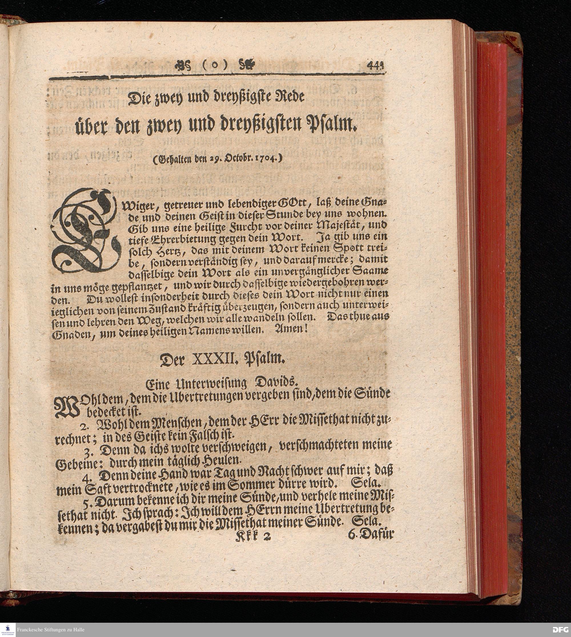 August Hermann Franckens, Weyl.Prof.Theol.Past.Ulr.und Schol. Erklärung Der Psalmen Davids; Erster [und] Anderer Theil, Mit einer Vorrede herausgegeben Von Gotthilf August Francken, S.S.Theol.Doct.und Prof.Publ.Ord.der ersten Dioeces des Saal-Creyses Inspectore und Pred.zur L.Fr. Andere Auflage. HALLE, in Verlegung des Wäysen=Hauses MDCCXLIII--MDCCXLV.